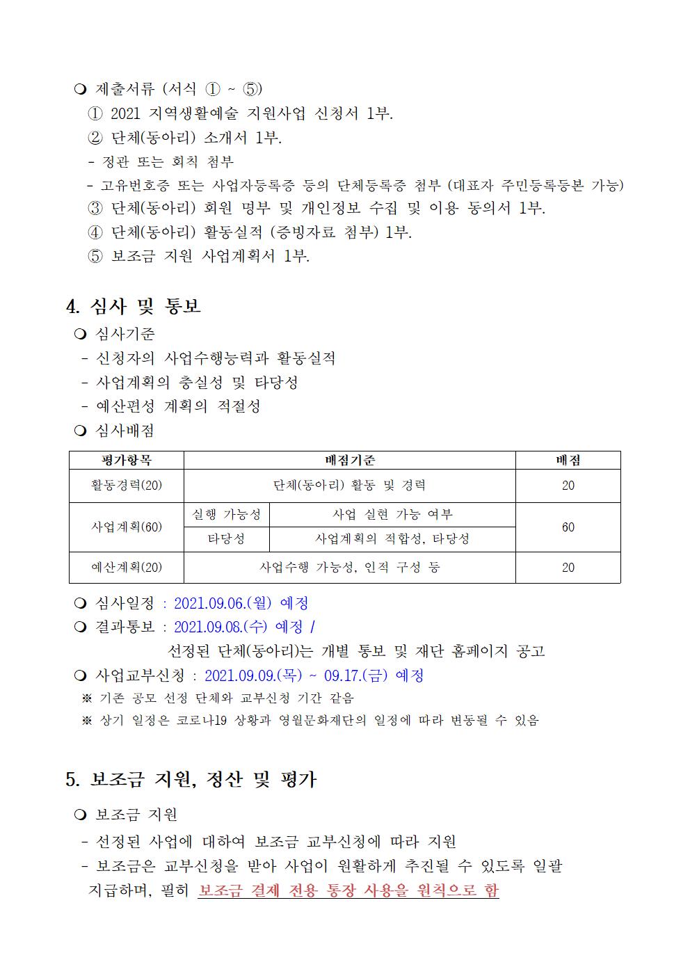「2021 지역 생활예술 지원사업」에 참여할 단체를 다음과 같이 공모하오니 관심 있는 생활예술 단체 및 동아리들의 많은 참여 바랍니다.