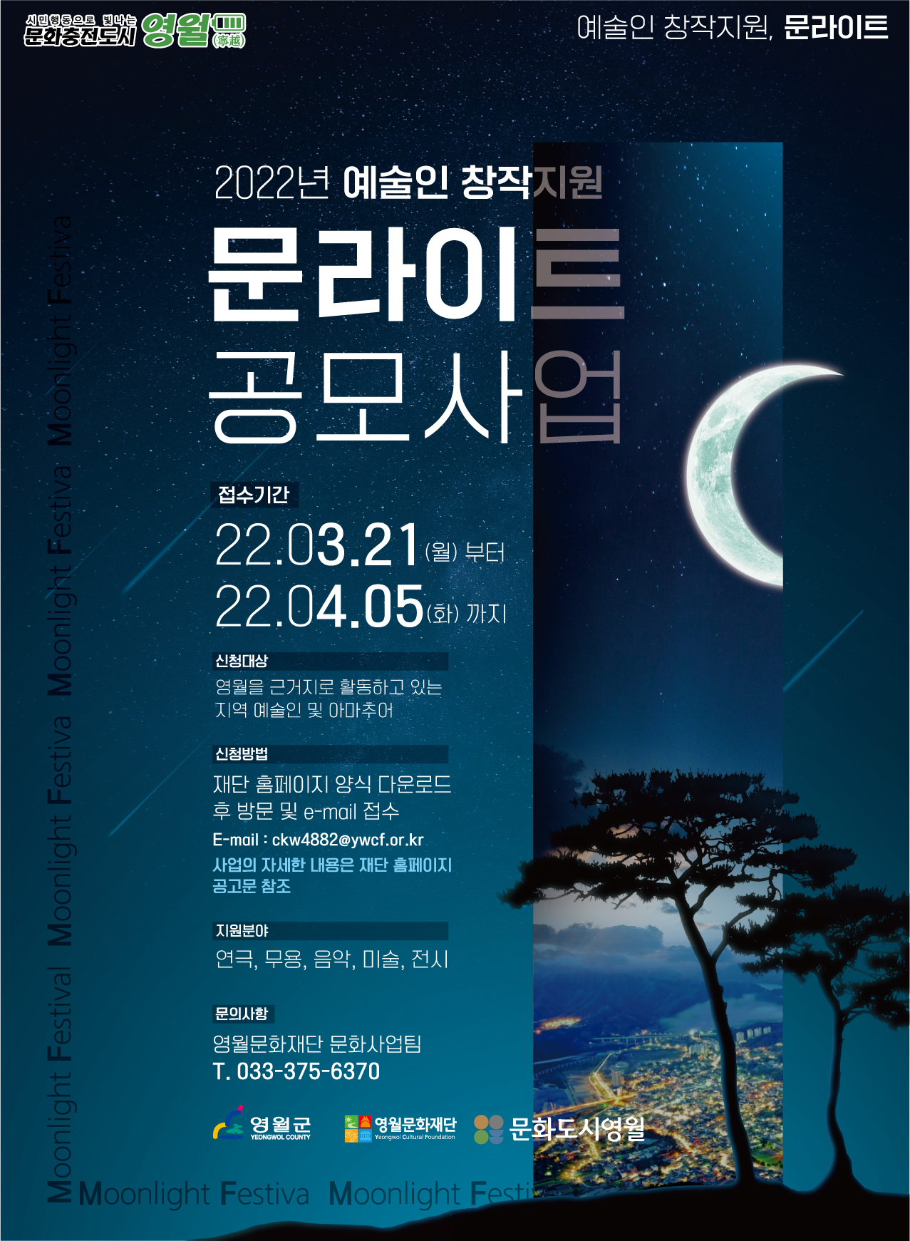 영월문화재단과 영월문화도시지원센터는 문화도시의 발판이 되고자 영월을 기반으로 왕성하게 활동하고 있는 전문 문화예술인 및 차세대 문화예술인에게 충분한 문화예술 활동의 여건을 제공하고, 창작의욕을 고취하고자 공모사업을 개최하오니 여러분의 많은 관심과 참여 바랍니다.
