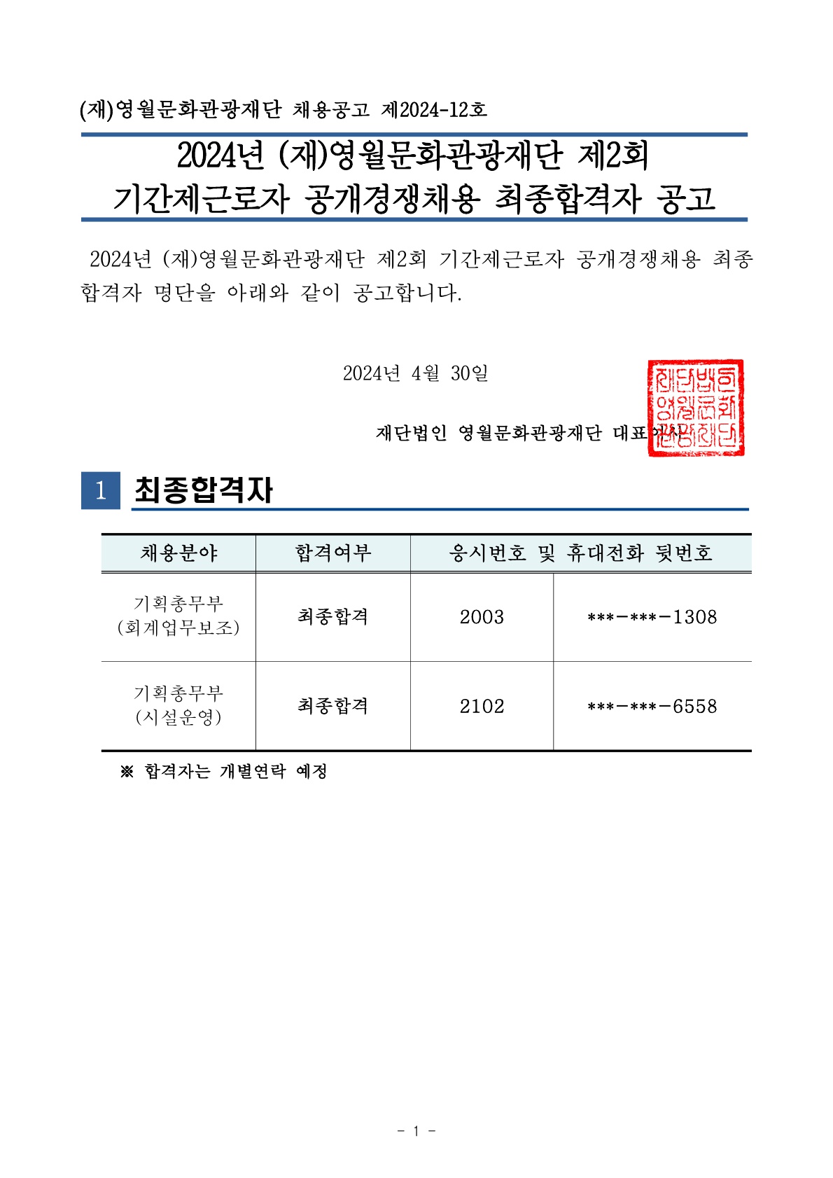 2024년 재영월문화관광재단 제2회 기간제근로자 공개경쟁채용 최종합격자 공고_1.jpg