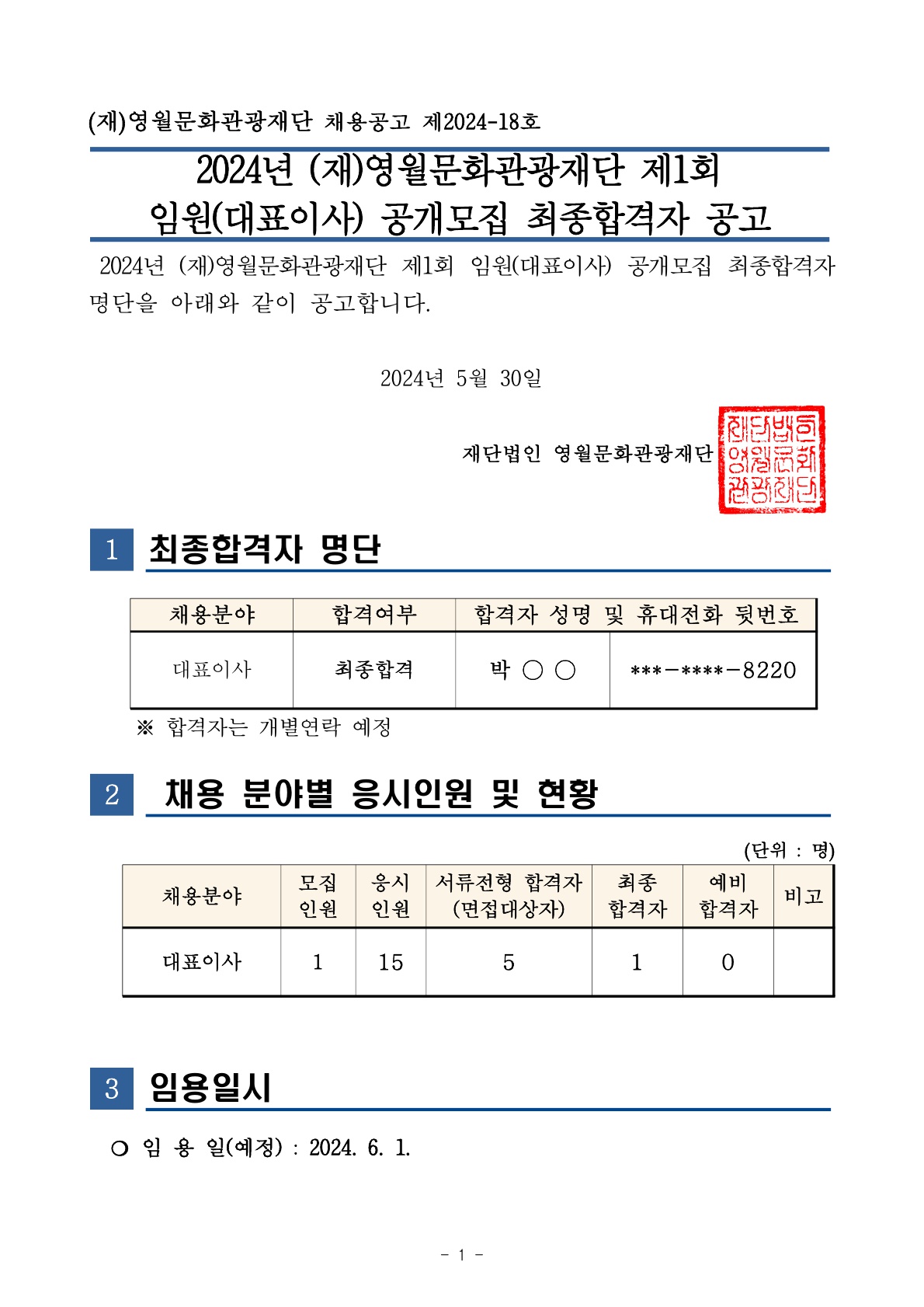 2024년 재영월문화관광재단 제1회 임원대표이사 공개모집 최종합격자 공고_1.jpg