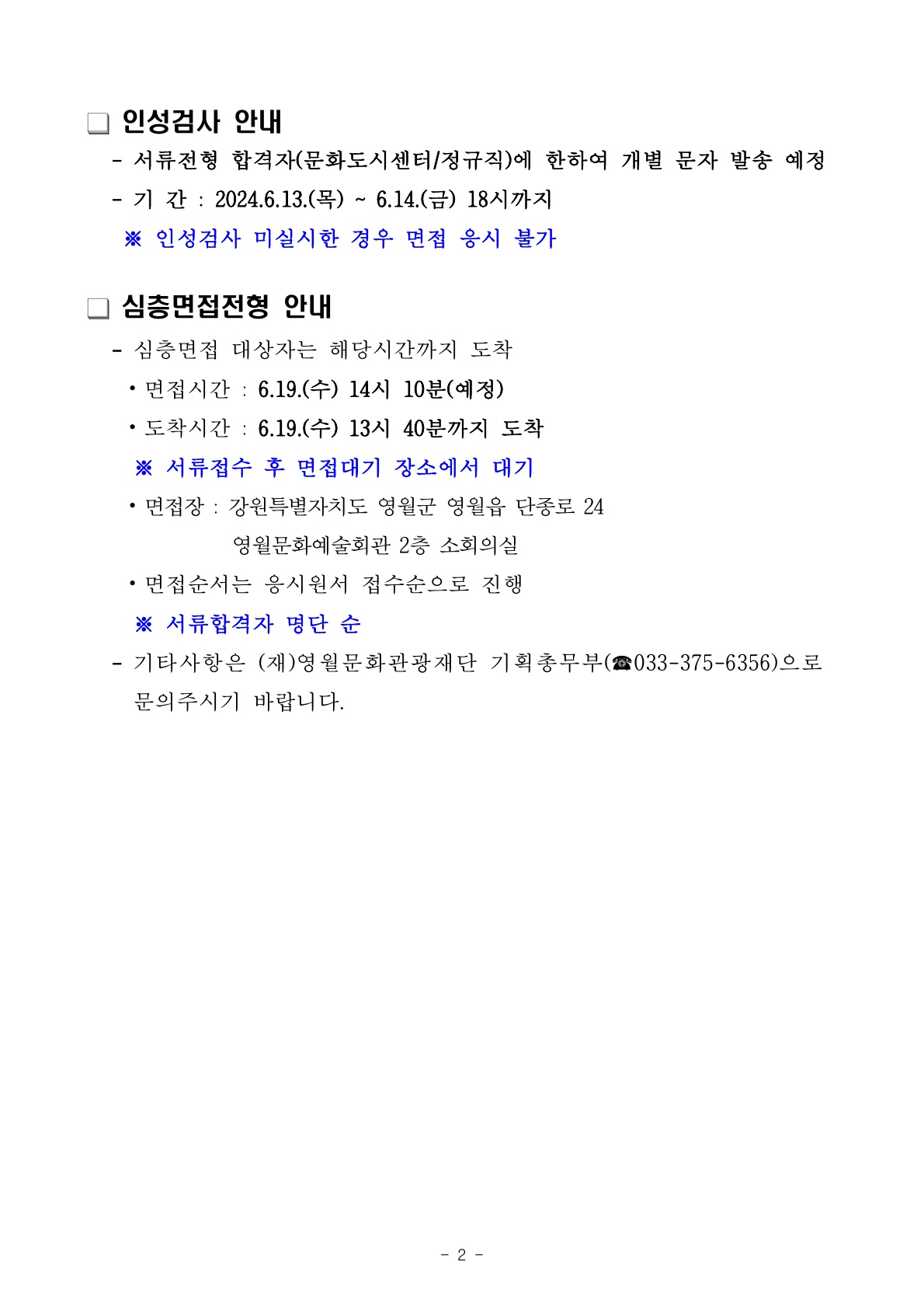 2024년 (재)영월문화관광재단 제3회 직원(정규직 및 기간제) 채용 서류합격자 공고 및 면접전형 일정 안내