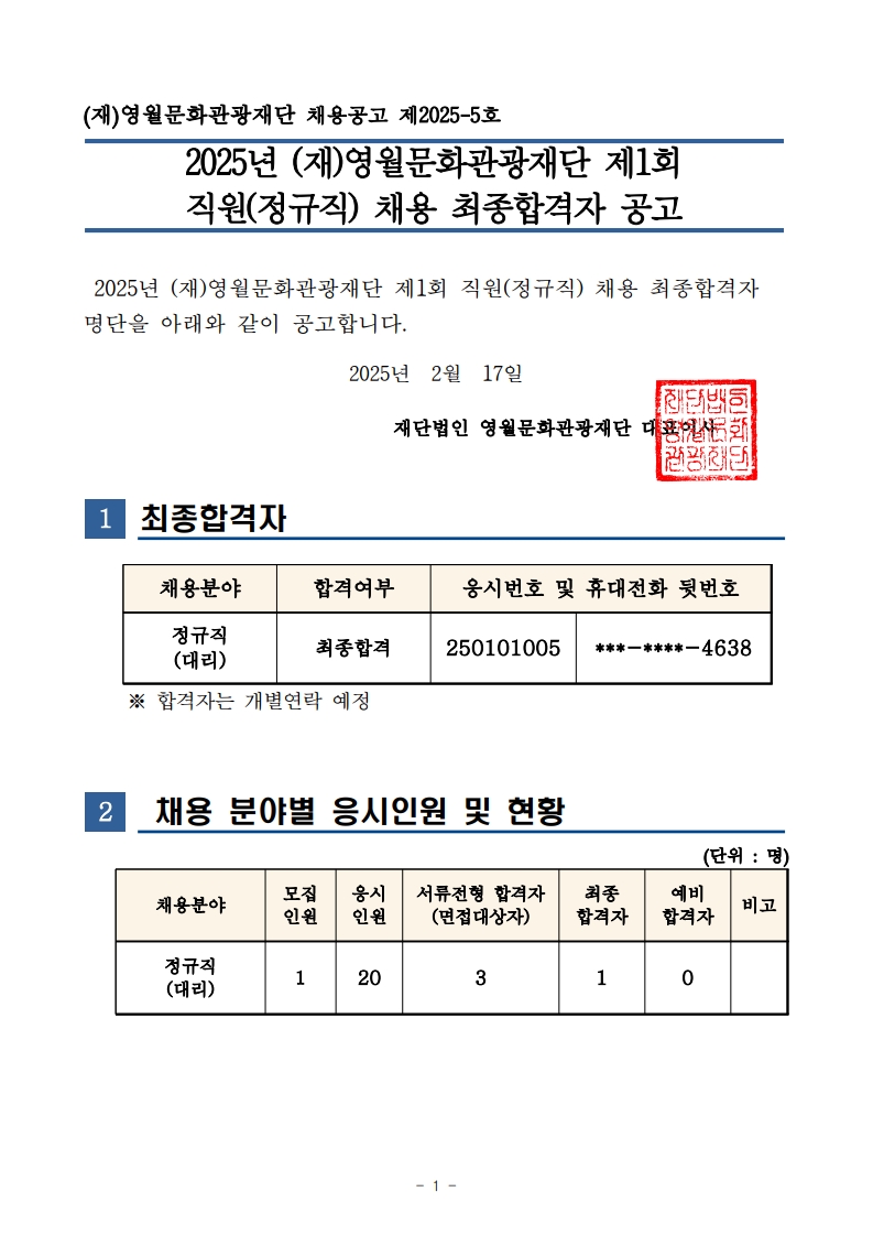 2025년 재영월문화관광재단 제1회 직원정규직 채용 최종합격자 공고_1.jpg