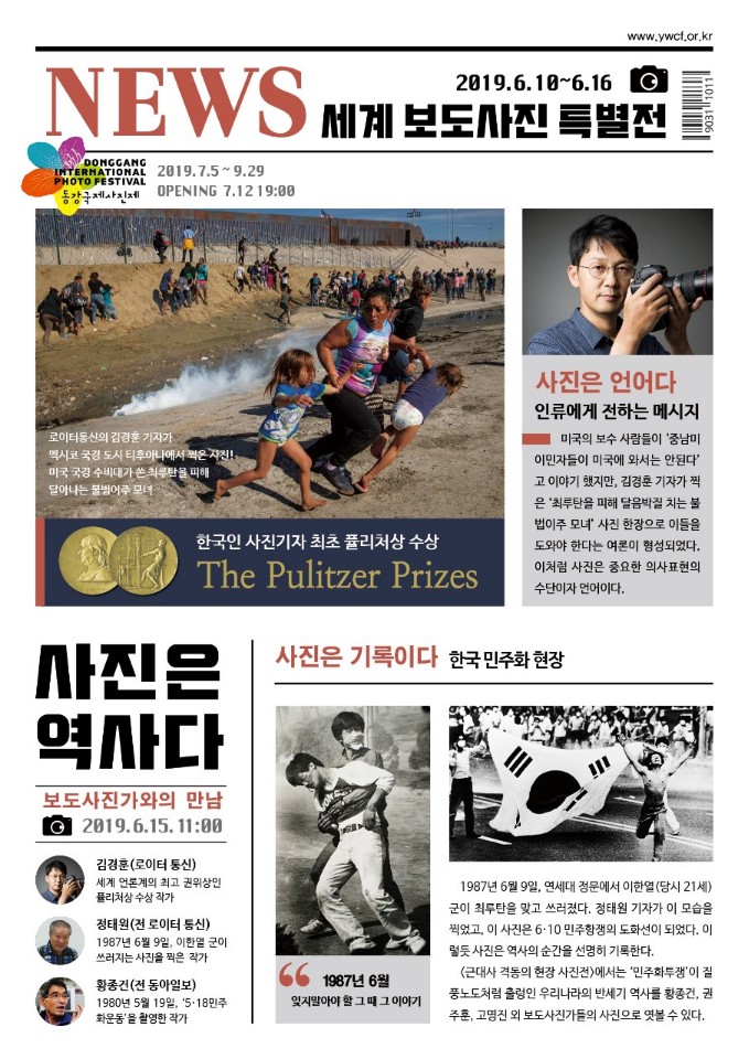 대한민국을 대표하는 전설의 사진기자들이 영월로 총출동한다. 영월미디어기자박물관(관장:고명진·전 한국일보기자)은 오는 10~16일 영월문화예술회관에서 `사진은 역사다'를 주제로 세계 보도사진 특별전을 개최한다. 이번 전시회에서는 한국인 최초로 세계 언론계의 최고 권위상인 퓰리처상을 수상한 김경훈 로이터통신 기자의 `최루탄을 피해 달음박질 치는 불법이주 모녀' 등을 감상할 수 있다. 특히 김 기자는 15일 오전 11시 영월 문화예술회관에서 고명진 관장과 정태원 전 로이터통신 기자 등 한국을 대표하는 사진기자들과 함께 관객과의 대화의 시간을 갖는다. 김경훈 기자는 이날 맥시코 국경 티후아나에서 미국 국경 수비대가 쏜 최루탄을 피해 달아나는 불법이주 모녀 이야기 등 생생한 사진 이야기를 나눌 예정이다. 정태원 기자는 1987년 6월9일 연세대 정문에서 이한열군이 최루탄에 맞고 쓰러지기 직전의 장면을 포착해 사진으로 남겼다. 이 사진 한장은 6·10 항쟁의 도화선이 됐다. 이와 함께 1980년 5·18 민주화운동을 촬영한 황종건 전 동아일보 기자, 권주훈 전 한국일보 기자 등의 작품도 한자리에서 만날 수 있다. 또 1980년대 암울한 대한민국의 현주소를 적나라하게 보여준 `아! 나의 조국'을 촬영한 고명진(전 한국일보) 관장과 김경태(전 한국일보)·조명동(전 경향신문)·김주만(전 중앙일보)·이상기(초대 아시아기자협회장) 기자 등의 사진도 전시된다.