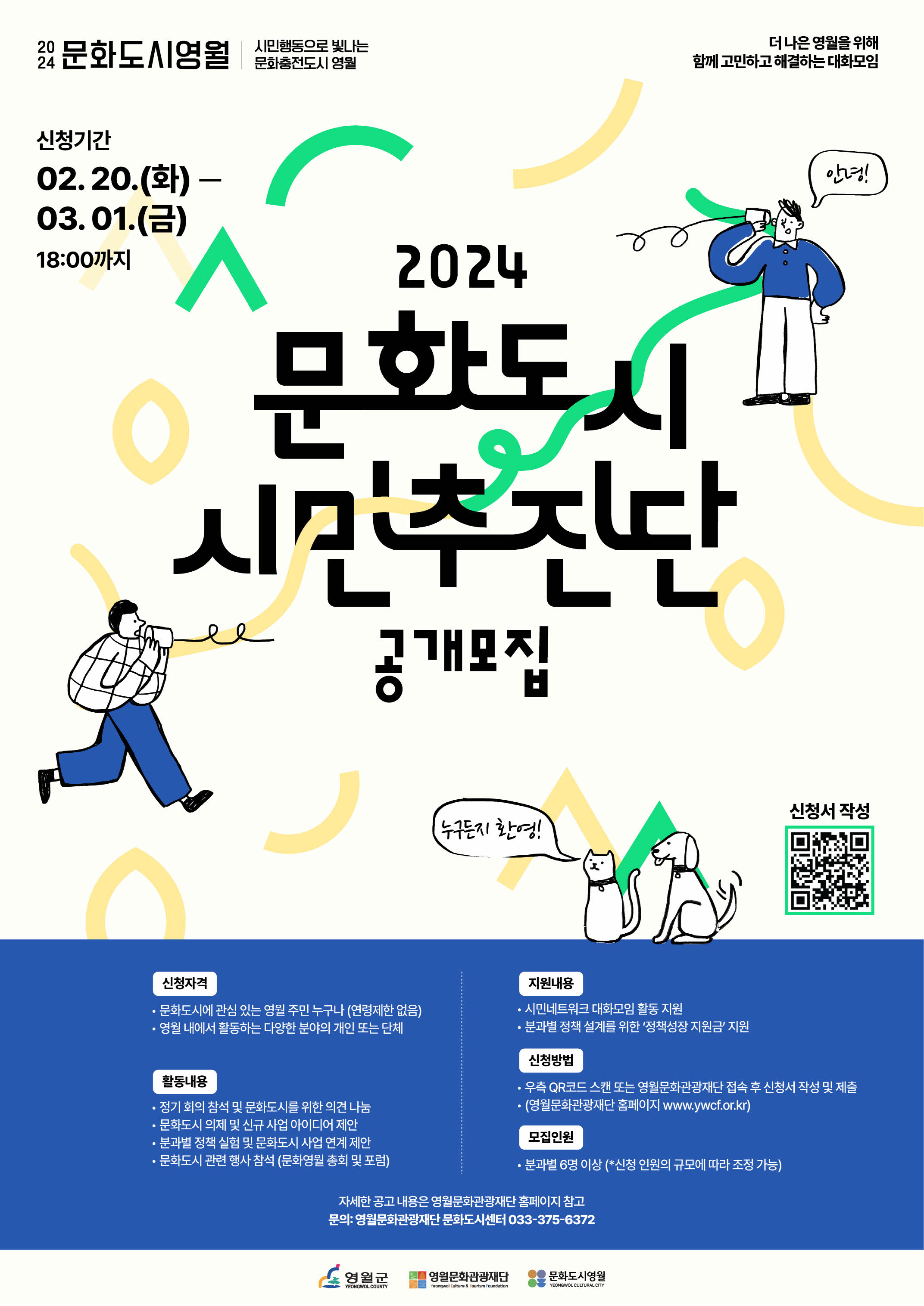영월문화관광재단 문화도시센터는 문화도시 영월을 함께 만들어 갈 ‘2024년 문화도시 시민추진단 참여자를 공개 모집한다.