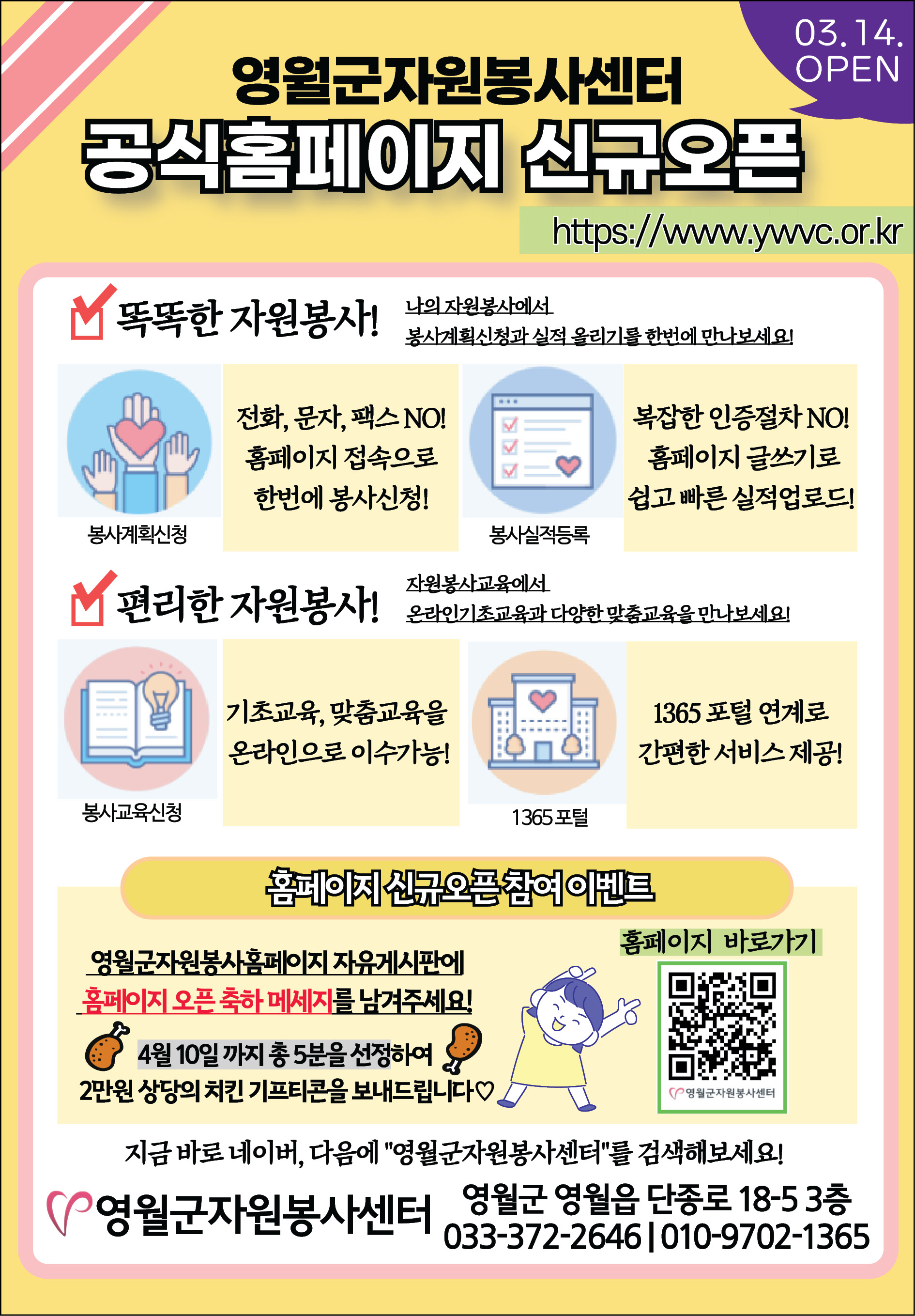 영월군자원봉사센터에서 홈페이지를 개설하였습니다. 오픈이벤트도 있으니 참고하세요.