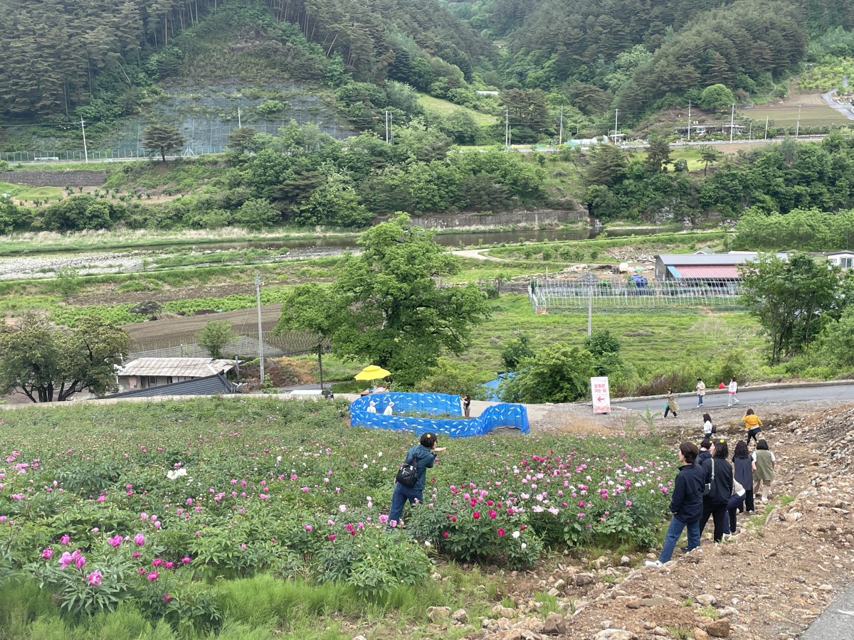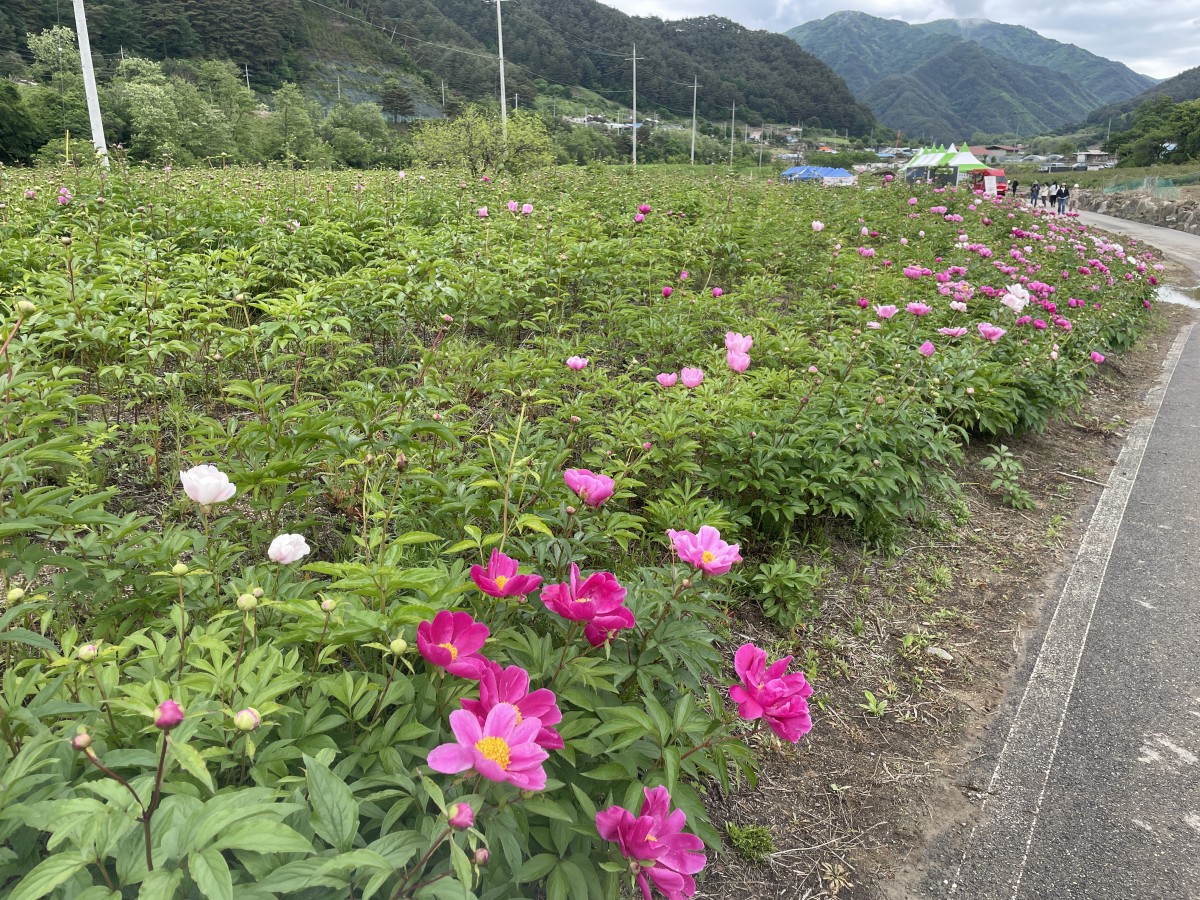 작약밭 사이에는 작약 로드길과 포토존 5곳이 설치돼 힐링 기회를 제공하며 작약뿌리를 활용한 국수와 막걸리·술떡·효소 등 먹거리도 판매합니다.