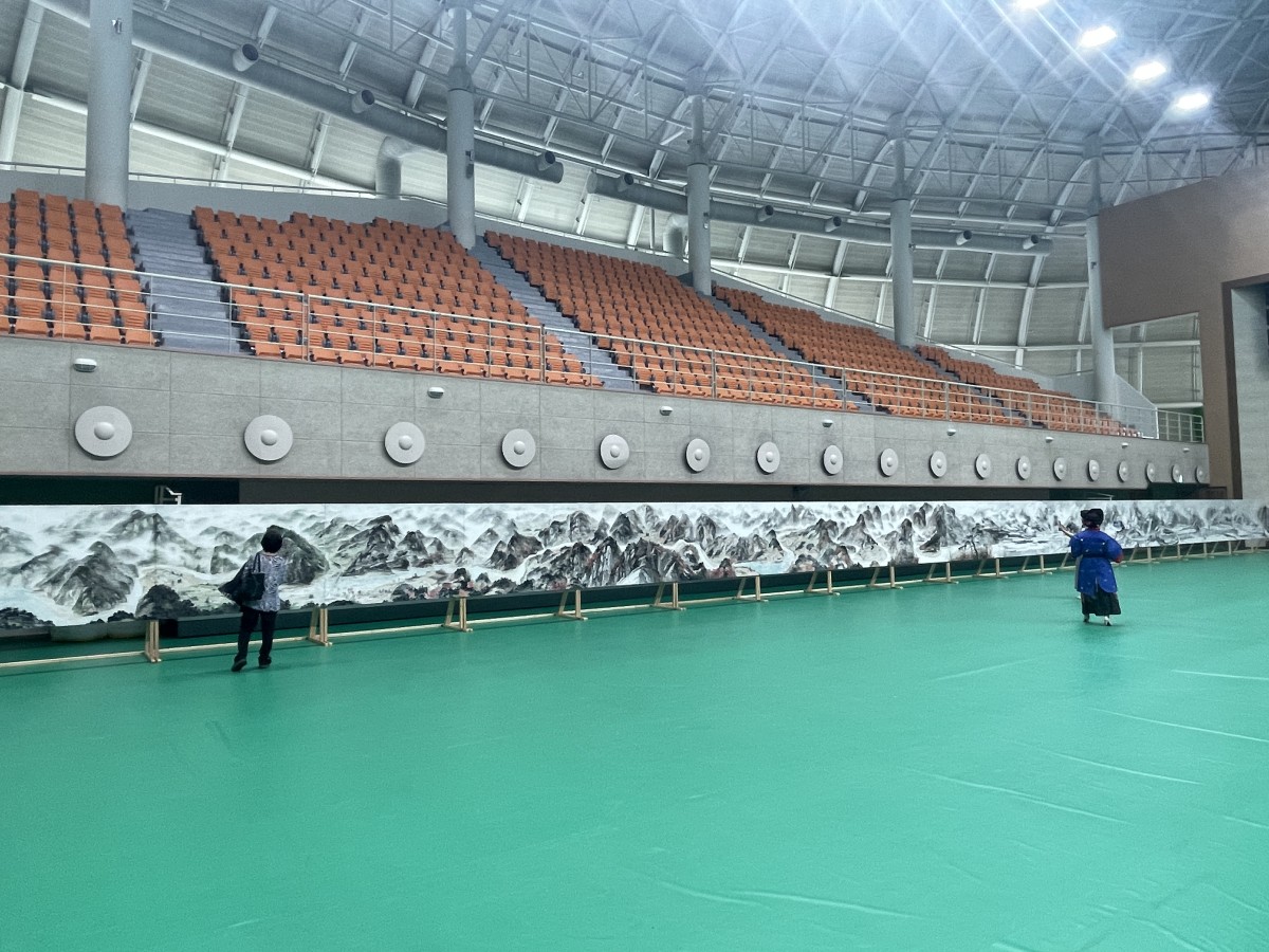 120호 크기의 개별 작품 34점을 연결해 하나의 대작으로 완성한 작품에는 수려한 산과 마을, 굽이치는 강물, 소나무 숲,