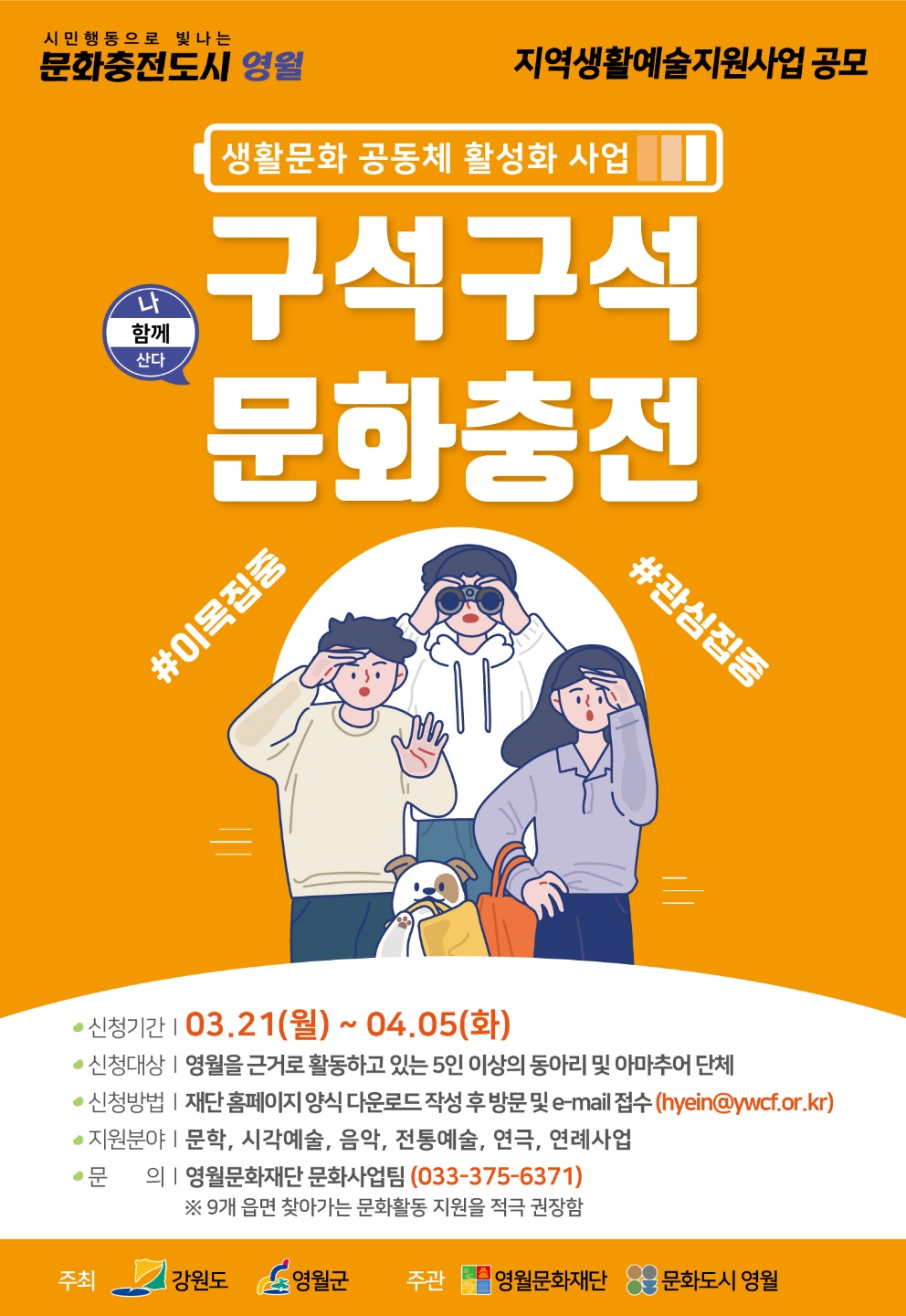 영월문화재단에서는 지역의 아마추어 생활예술단체 및 동아리의 예술 활동을 지원하고 지역 생활문화예술 활성화를 위해『구석구석 문화충전』지원사업에 참여할 단체를 다음과 같이 공모하오니 관심 있는 생활예술단체 및 동아리들의 많은 참여 바랍니다.