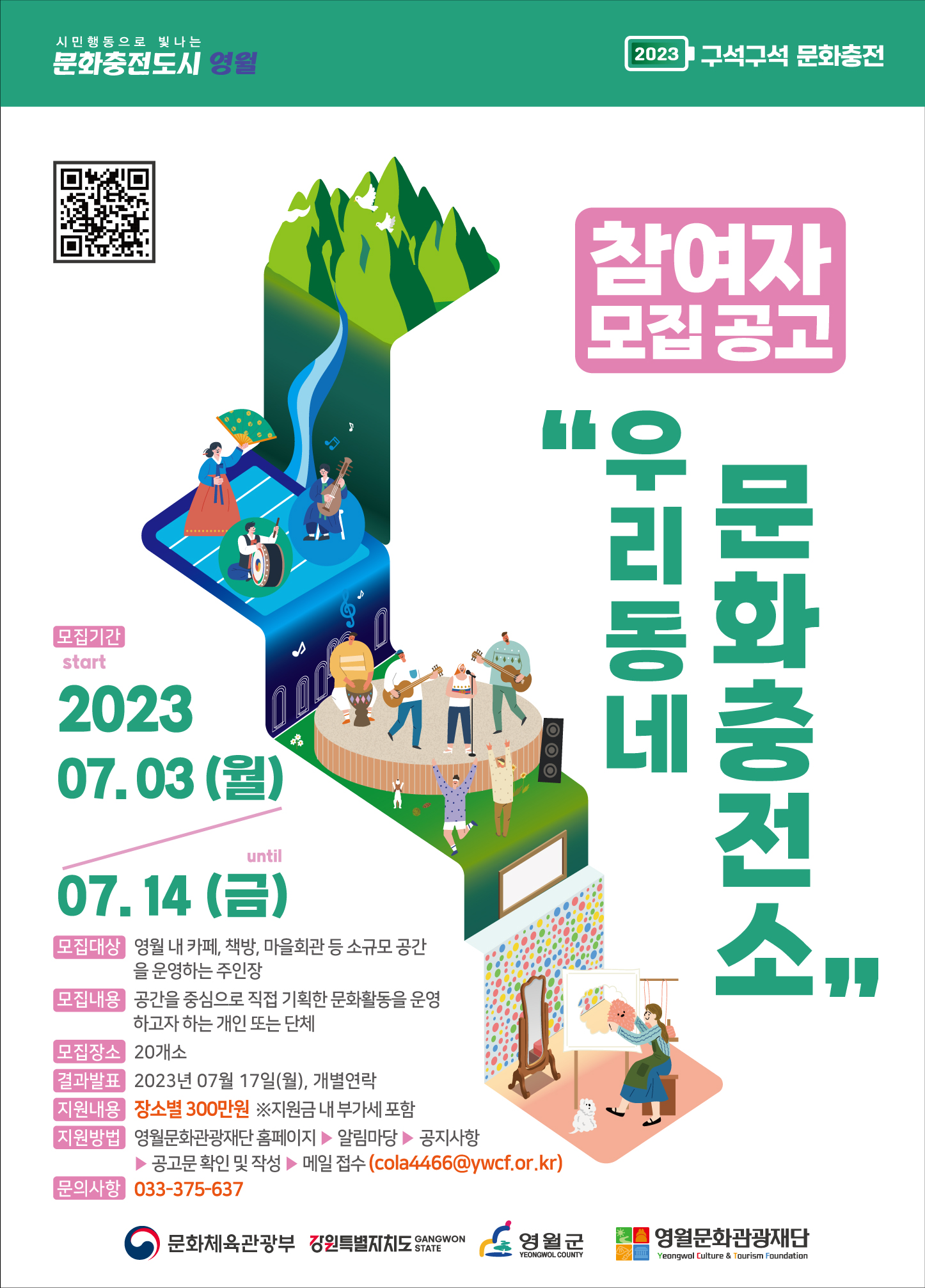 □ 모집내용 : 영월 관내 위치한 민간 소유의 공간 혹은 유휴 공간 중, 문화 공간 조성 및 문화 프로젝트 운영을 하고자 하는 주민 모집