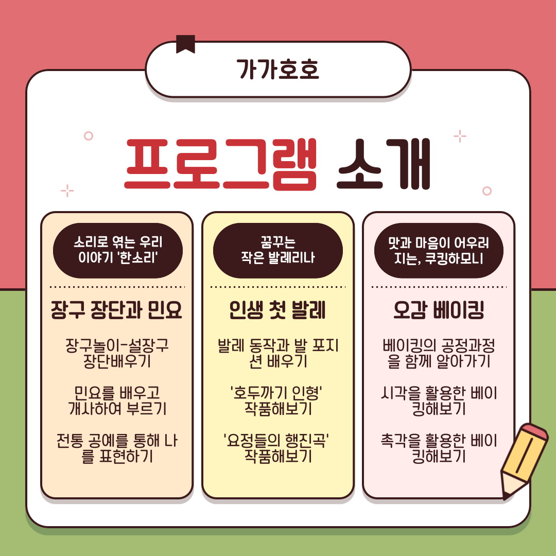 025년 생활밀착형 문화예술교육 지원사업 ‘가가호호’ 추가 프로그램 참여자를 다음과 같이 모집하오니 많은 관심과 참여 부탁드립니다.