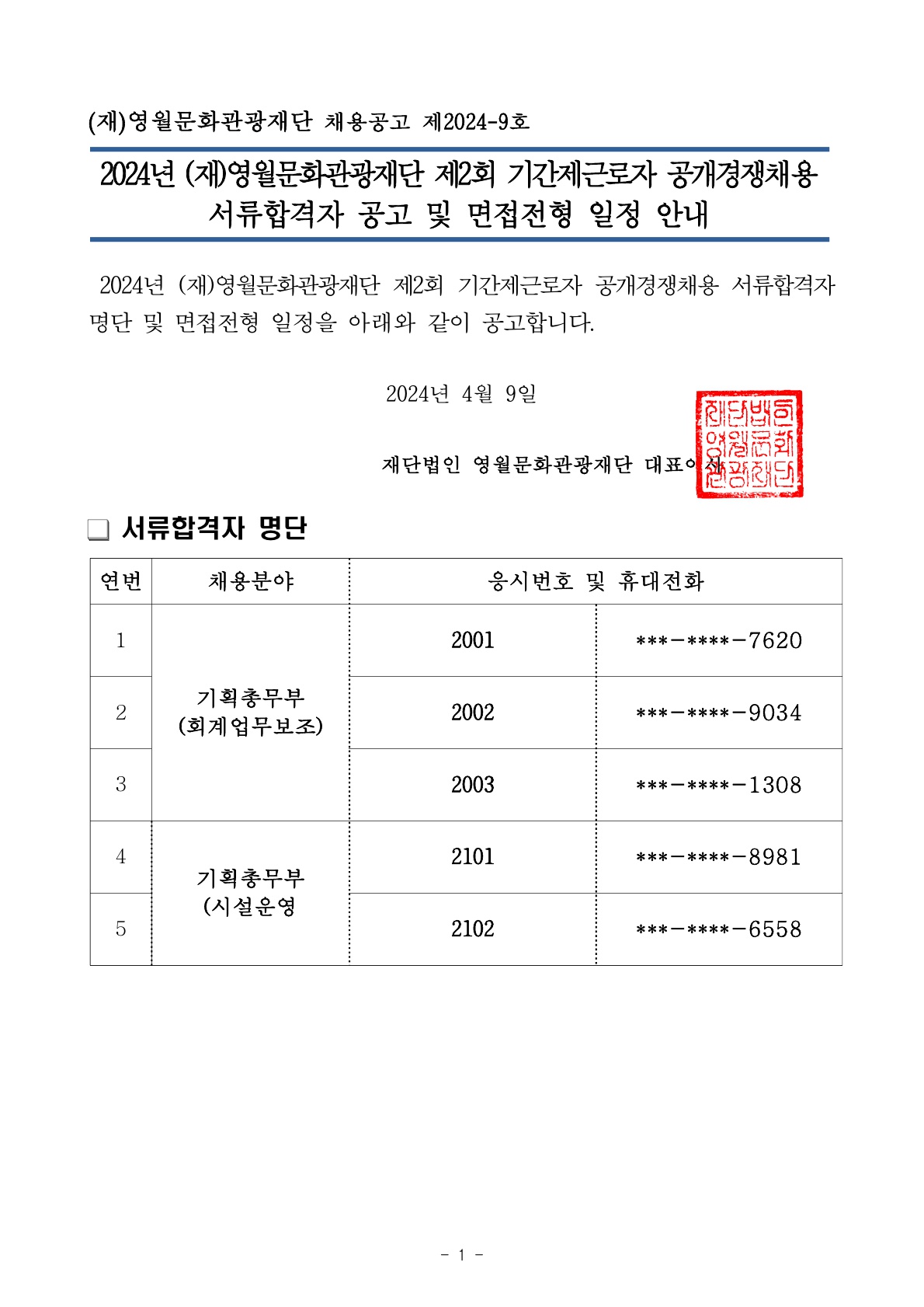 2024년 제2회 기간제근로자 공개경쟁채용 서류합격자 공고 및 면접전형 일정 안내_1.jpg