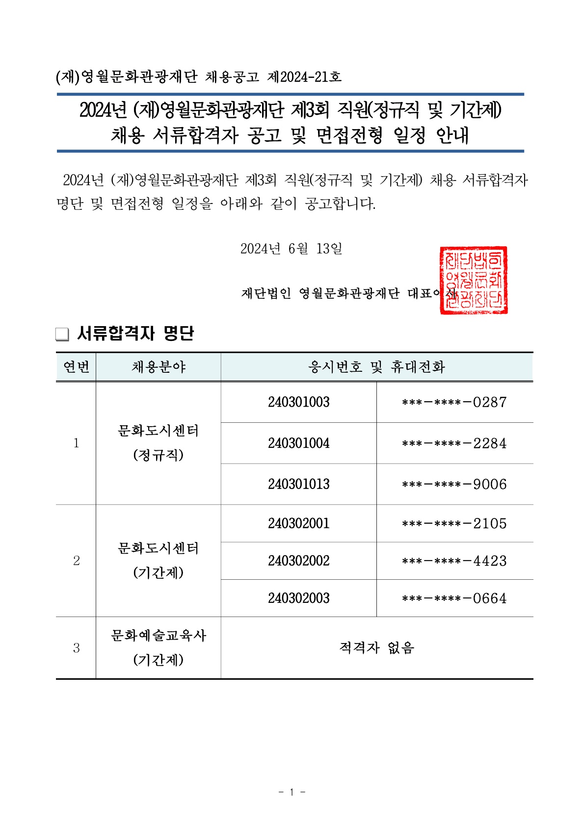 2024년 (재)영월문화관광재단 제3회 직원(정규직 및 기간제) 채용 서류합격자 공고 및 면접전형 일정 안내