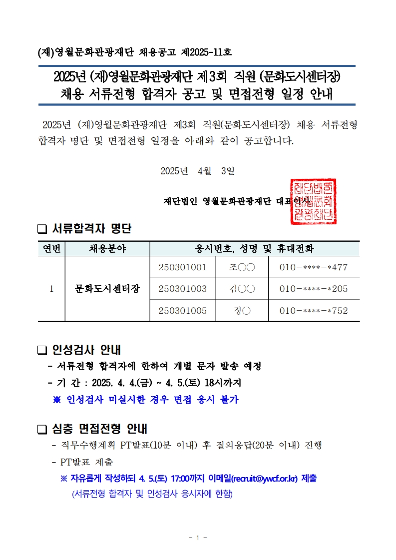 2025년 제3회 직원문화도시센터장 채용 서류전형 합격자 공고 및 면접전형 일정 안내_1.jpg