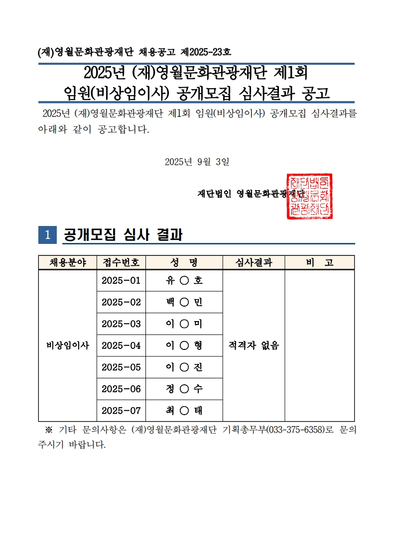 <2025년 제1회 (재)영월문화관광재단 임원(비상임이사) 공개모집 심사결과 공고>