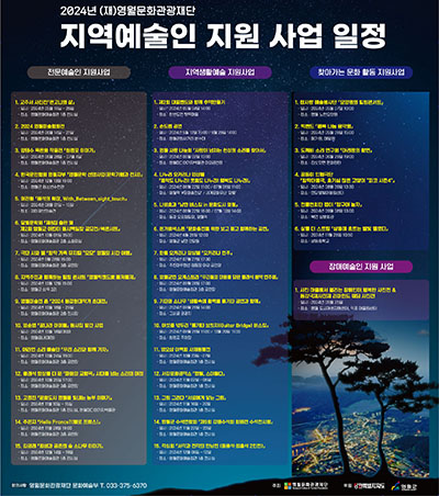 (영월=연합뉴스) 배연호 기자 = 강원 영월문화관광재단은 2024년 지역예술인 지원 사업으로 37개 단체를 선정했다고 22일 밝혔다.