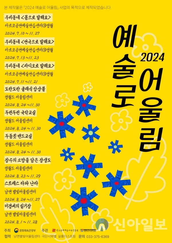 '2024 예술로 어울림'은 문화 취약지역에 거주하는 주민들을 대상으로 문화 예술교육 프로그램에 참여할 기회를 높이고, 지역 예술인(단체)들과 협력하여 지역 맞춤형 프로그램을 개발하고 활동의 범위를 넓혀 정주여건을 확대하기 위한 사업이다.