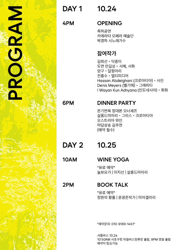 2주동안 닥종이예술, 달항아리, 회화, 서예 및 서화, 멀티미디어, 설치미술, 그래피티, 사진, 와인요가, 북토크등 다양한 프로그램이 진행된다.
