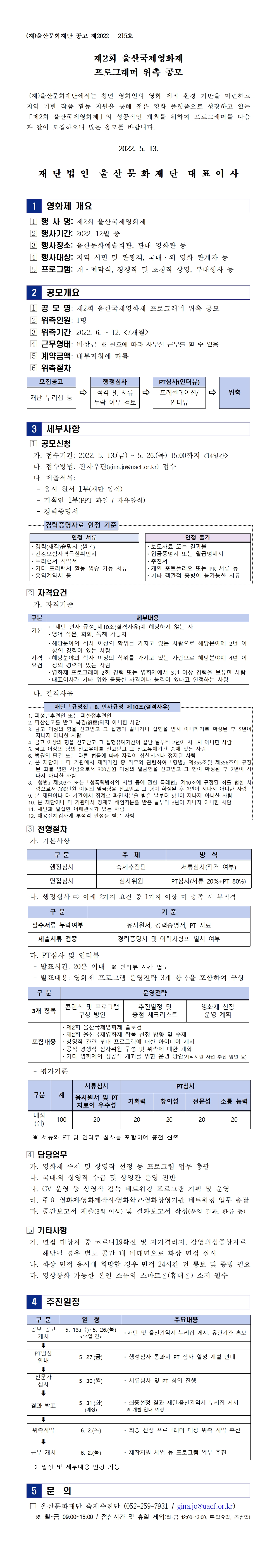 1. 공고명 : 제2회 울산국제영화제 프로그래머 위촉 공모 공고2. 모집기간 : 2022.05.13.(금) ~ 2022.05.26.(목) 15:00 마감