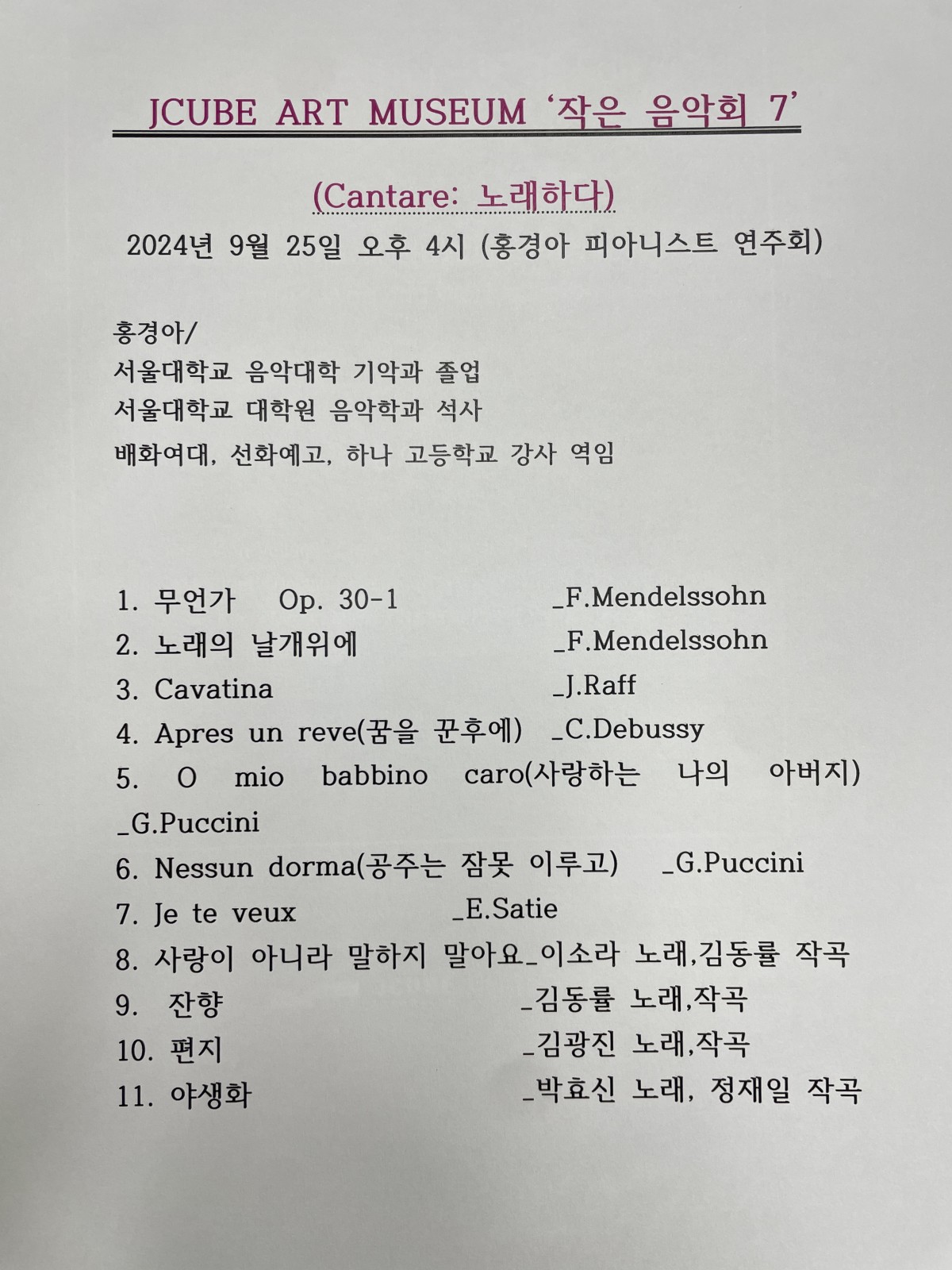 특히, 9월 25일(수) 오후 4시에는 홍경아 피아니스트의 '작은 음악회 7' 가 계획되어 있습니다.