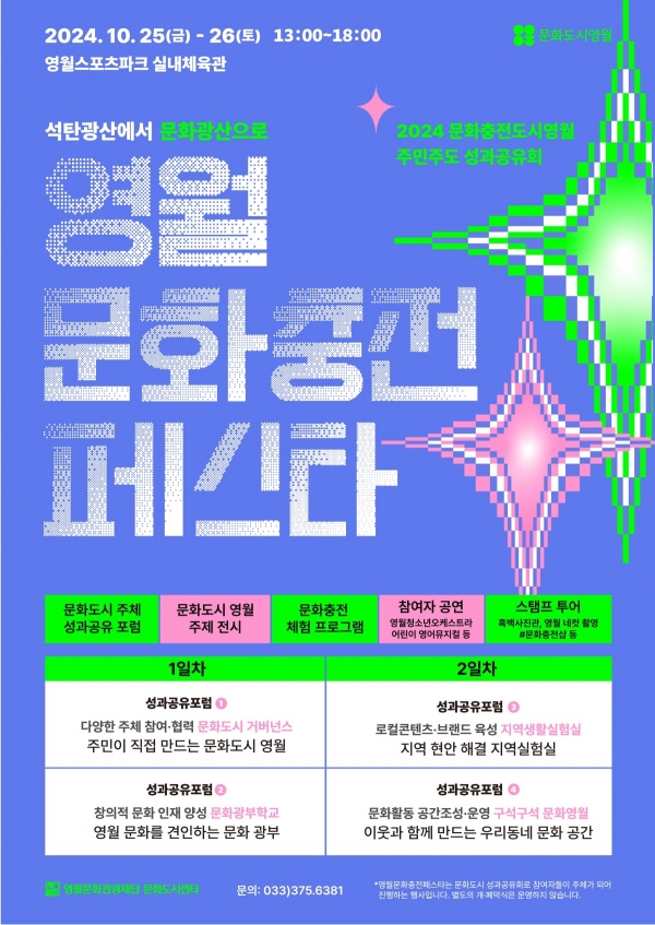 25일에는 주민이 직접 만드는 문화도시 영월, 영월 문화를 견인하는 문화 광부, 26일에는 지역 현안 해결 지역실험실, 이웃과 함께 만드는 우리 동네 문화 공간을 주제로 성과 공유 포럼이 진행된다. 양일에 걸쳐 사업 참여자들이 준비한 다양한 체험 행사가 운영된다. 또, 각 포럼 시작 전에는 문화도시 참여 주민들이 준비한 사전 공연도 열려, 주민 주도의 성과발표가 진행된다.