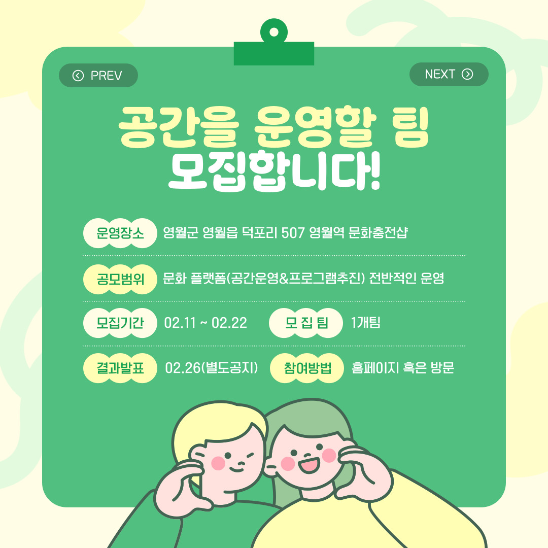 2026년 문화도시 추진 사업 일환인 「영월역 문화충전샵」의 공간활용 팀을 모집합니다.