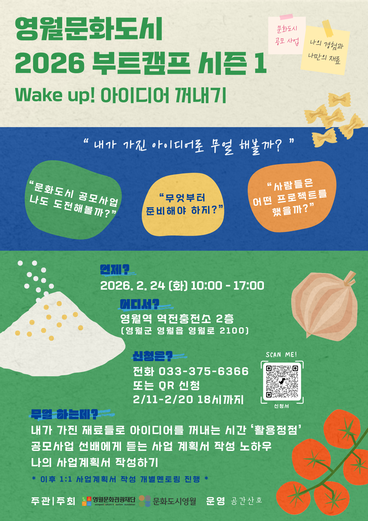 (재)영월문화관광재단 문화도시센터는 오는 2월 24일(화), 영월역 문화충전소에서 지역민의 창의적인 로컬 아이디어를 발굴하고 실무적인 사업계획서로 구체화하기 위한
