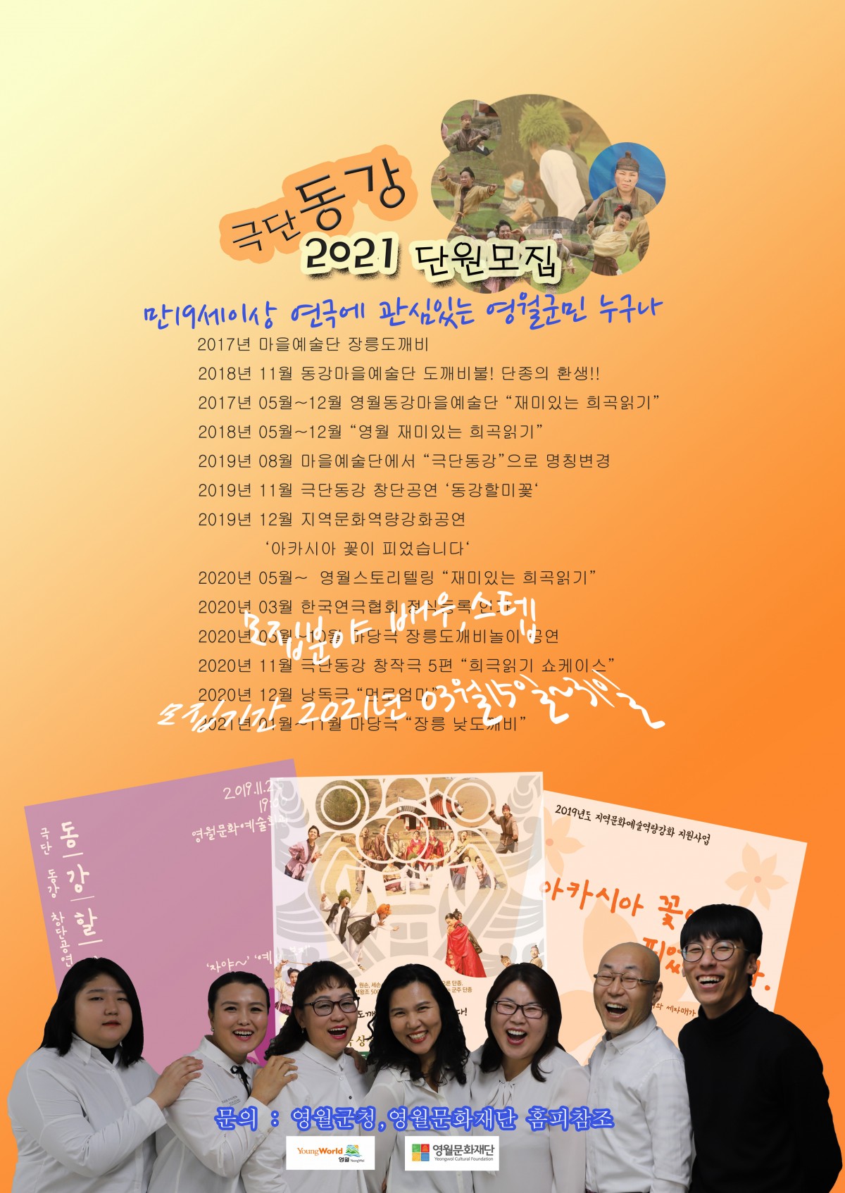 극단동강에서는 관내 문화예술인 및 연극에 관심 있는 군민을 대상으로 지역 예술인 간 네트워크 확장 및 정기 활동을 위해 다음과 같이 단원을 공개 모집하오니 많이 참여하여 주시기 바랍니다.