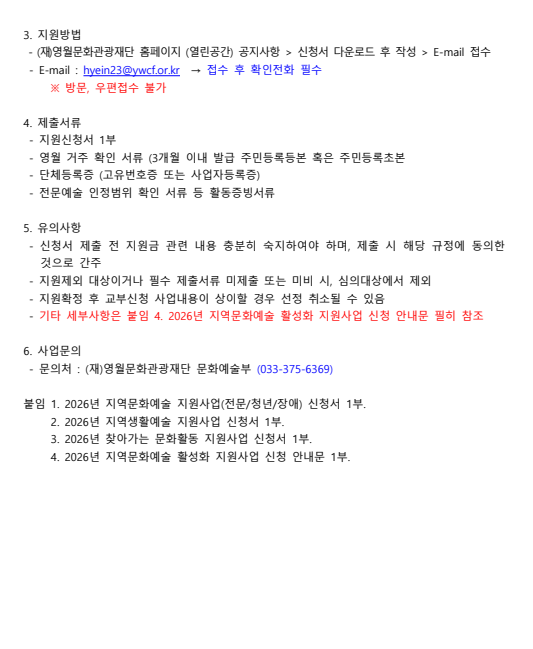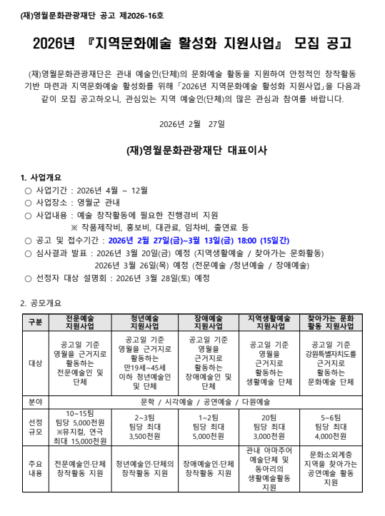 ⇒ 지원사업의 자세한 세부내용은 붙임 문서의 '2026년 지역문화예술 활성화 지원사업' 신청 안내문을 필히 숙지하시고 참고하시길 바랍니다.