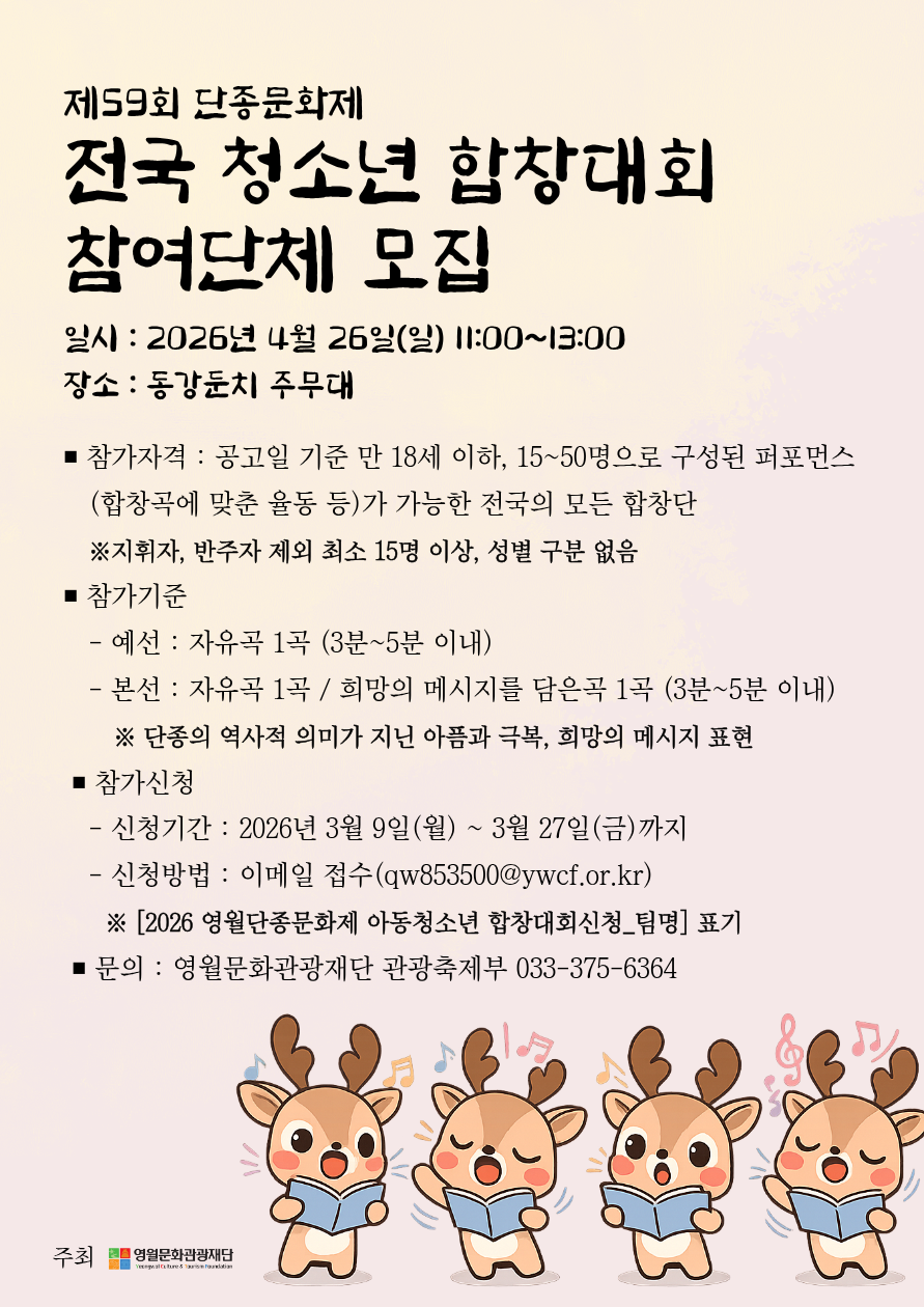 2026년 제59회 단종문화제 전국 청소년 합창대회 참여팀 모집과 관련하여 아래와 같이 공고하고자 합니