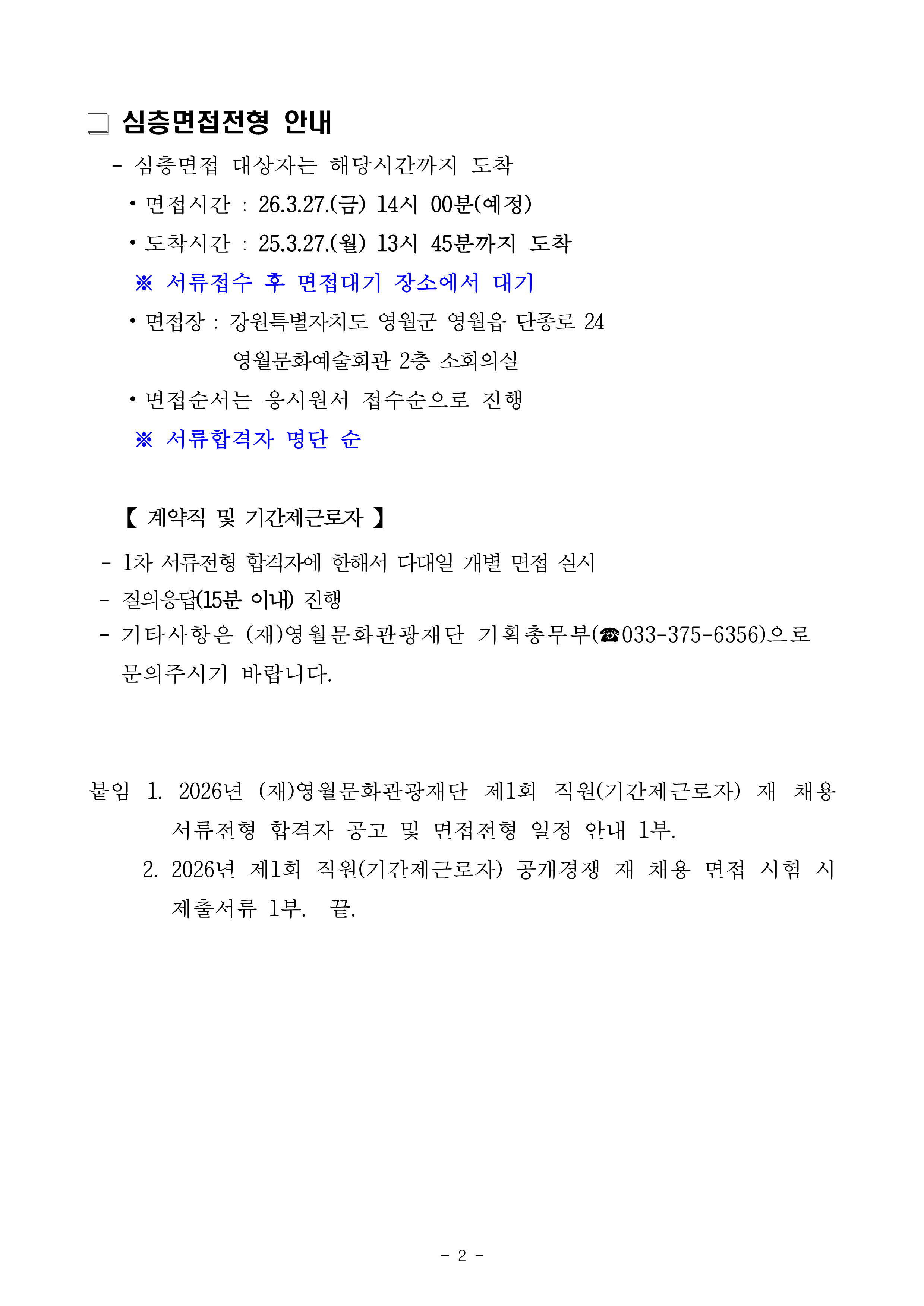 2026년 (재)영월문화관광재단 제3회 직원(기간제근로자) 공개경쟁 채용 서류전형합격자 공고 및 면접전형 일정 안내