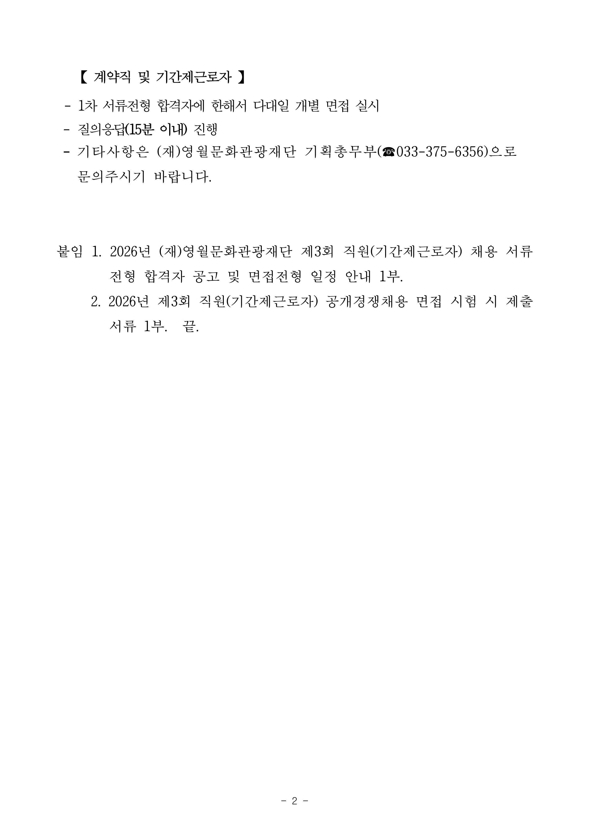 2026년 (재)영월문화관광재단 제3회 직원(기간제근로자) 공개경쟁 채용 서류전형합격자 공고 및 면접전형 일정 안내