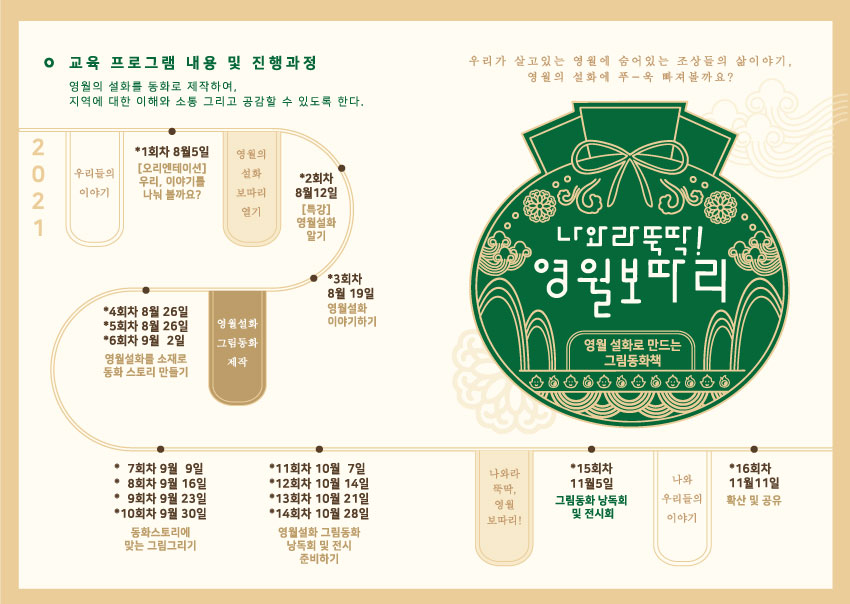 (재)영월문화재단은 문화예술교육사 현장역량 강화 지원사업으로 진행하는 영월 설화 그림동화책 제작 프로그램인 <나와라 뚝딱! 영월보따리> 참가자를 모집하고자 합니다.
