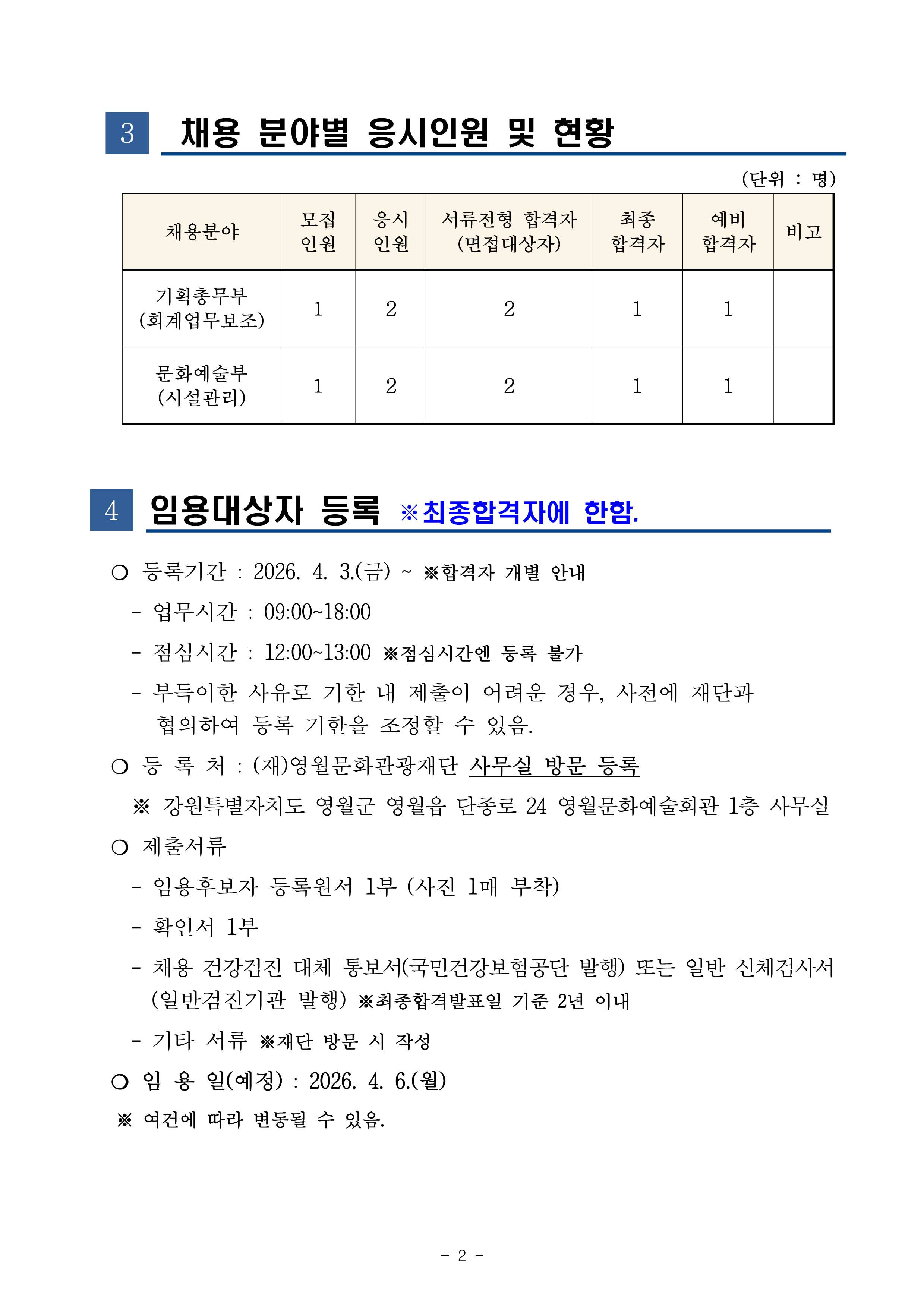2026년 (재)영월문화관광재단 제4회 직원(기간제 근로자) 공개경쟁채용 공고