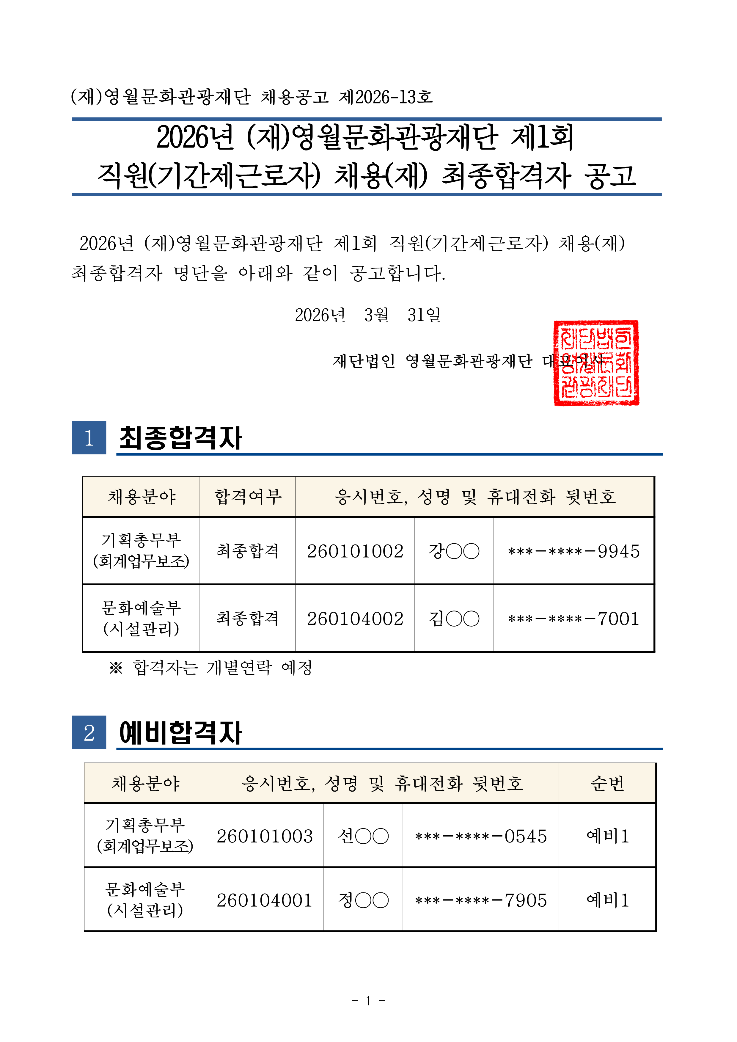 2026년 제1회 직원(기간제근로자) 재 채용 최종합격자 및 예비합격자 공고