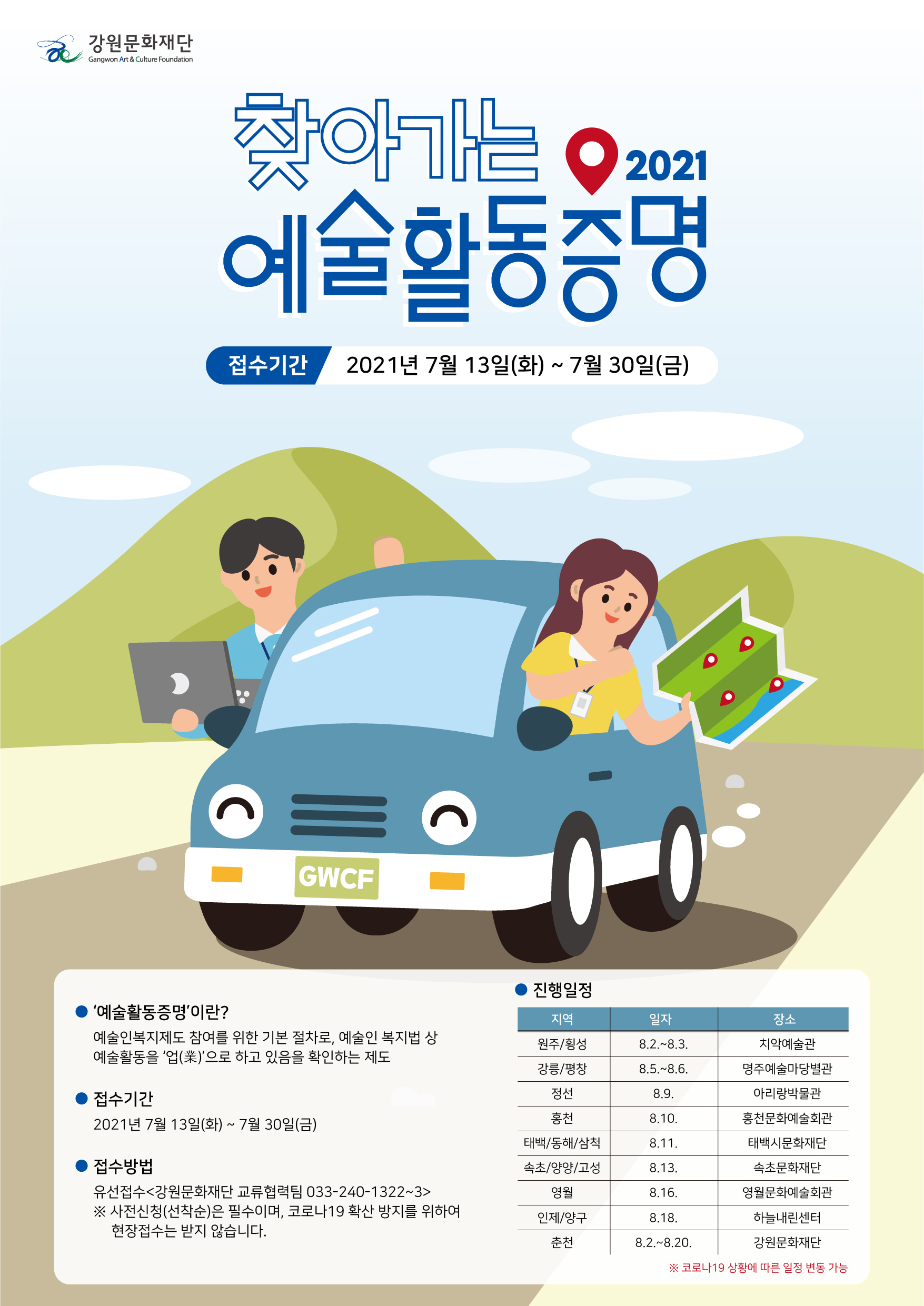 예술활동 증명이란? - 예술인 복지제도 참여를 위한 기본 절차로, 예술인 복지법 상 예술활동을 업(業)으로하고 있음을 확인하는 제도 접수기간 - 2021년 7월 13일(화) ~ 7월 30일(금) 접수방법 - 유선접수<강원문화재단 교유협력팀 033-240-1322~3> ※ 사전신청(선착순)은 필수이며, 코로나19 확산 방지를 위하여 현장접수는 받지않습니다.