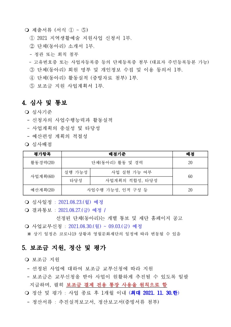 「2021 지역 생활예술 지원사업」에 참여할 단체를 다음과 같이 공모하오니 관심 있는 생활예술 단체 및 동아리들의 많은 참여 바랍니다.