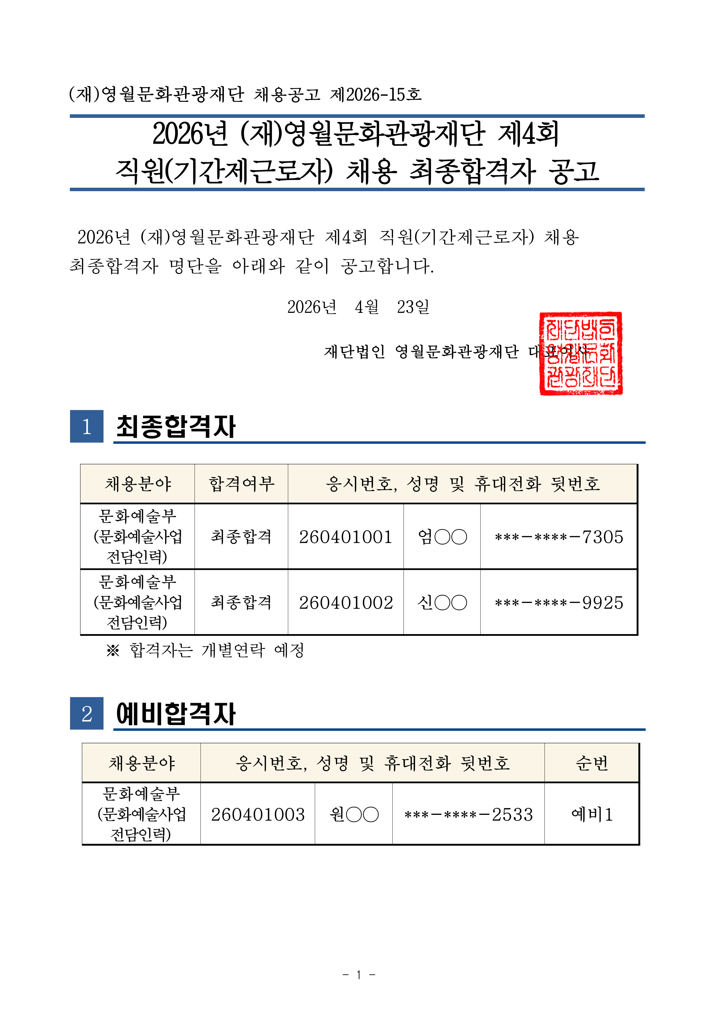 2026년 제4회 직원(기간제근로자) 채용 최종합격자 및 예비합격자 공고