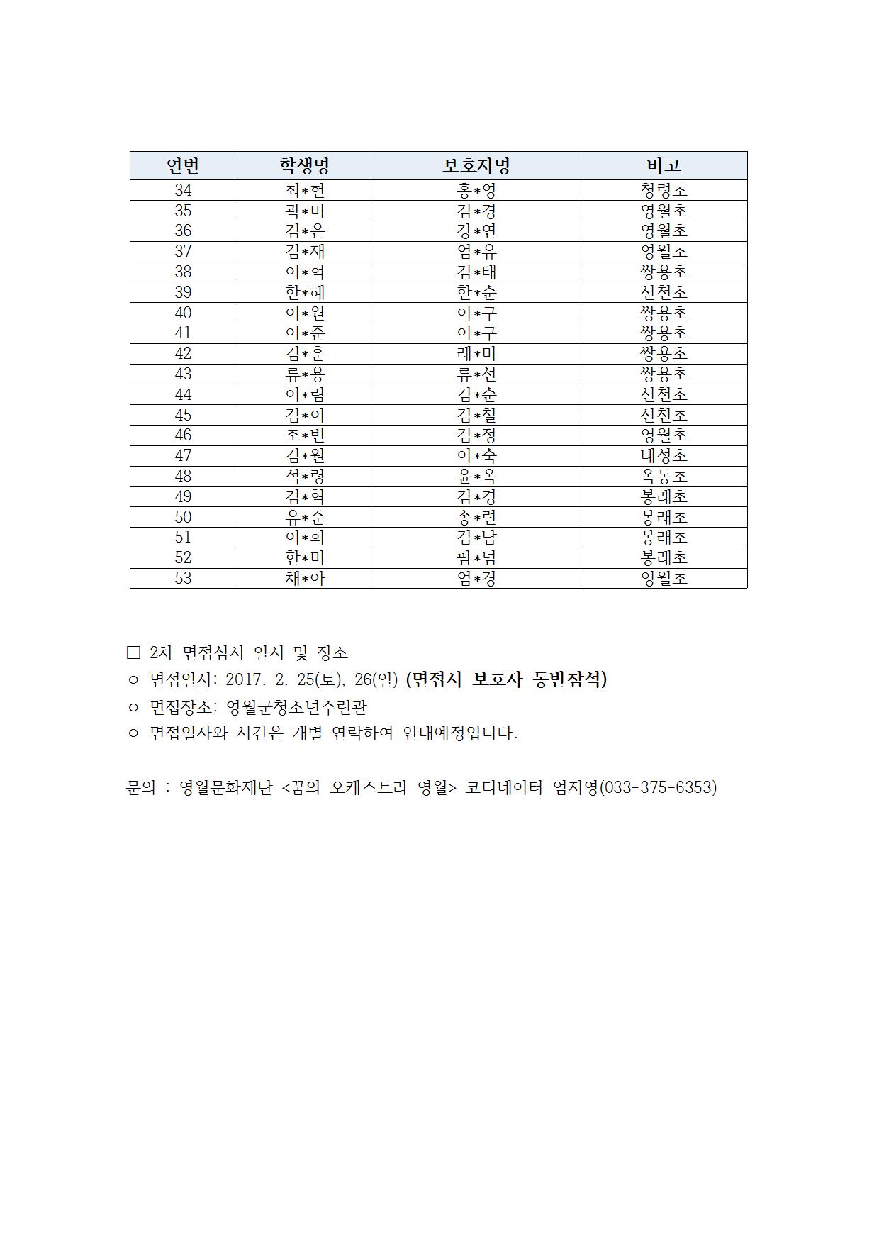 2017 꿈의 오케스트라 '영월' 음악강사 면접시험 합격자 공고