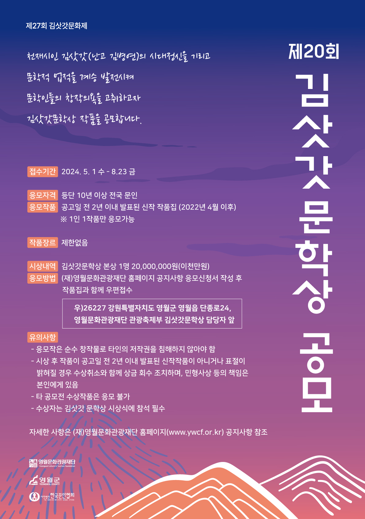접수기간 : 2024.4.1(월)~8.23(금) 응모자격 : 등단 10년이상 전국 문인 응모작품 : 공고일 전 2년 이내 발표된 신작 작품집(2022년 4월 이후) ※ 1인 1작품만 응모가능 작품장르 : 제한없음 시상내역 : 김삿갓문학상 본상 1명 20,000,000원(이천만원) 응모방법 : (재)영월문화관광재단 홈페이지 공지사항 응모신청서 작성 후 작품집과 함께 우편접수 *주소: 26227) 강원특별자치도 영월군 영월읍 단종로 24, 영월문화예술회관 영월문화관광재단 관광축제부 김삿갓문학상 담당자 앞 |