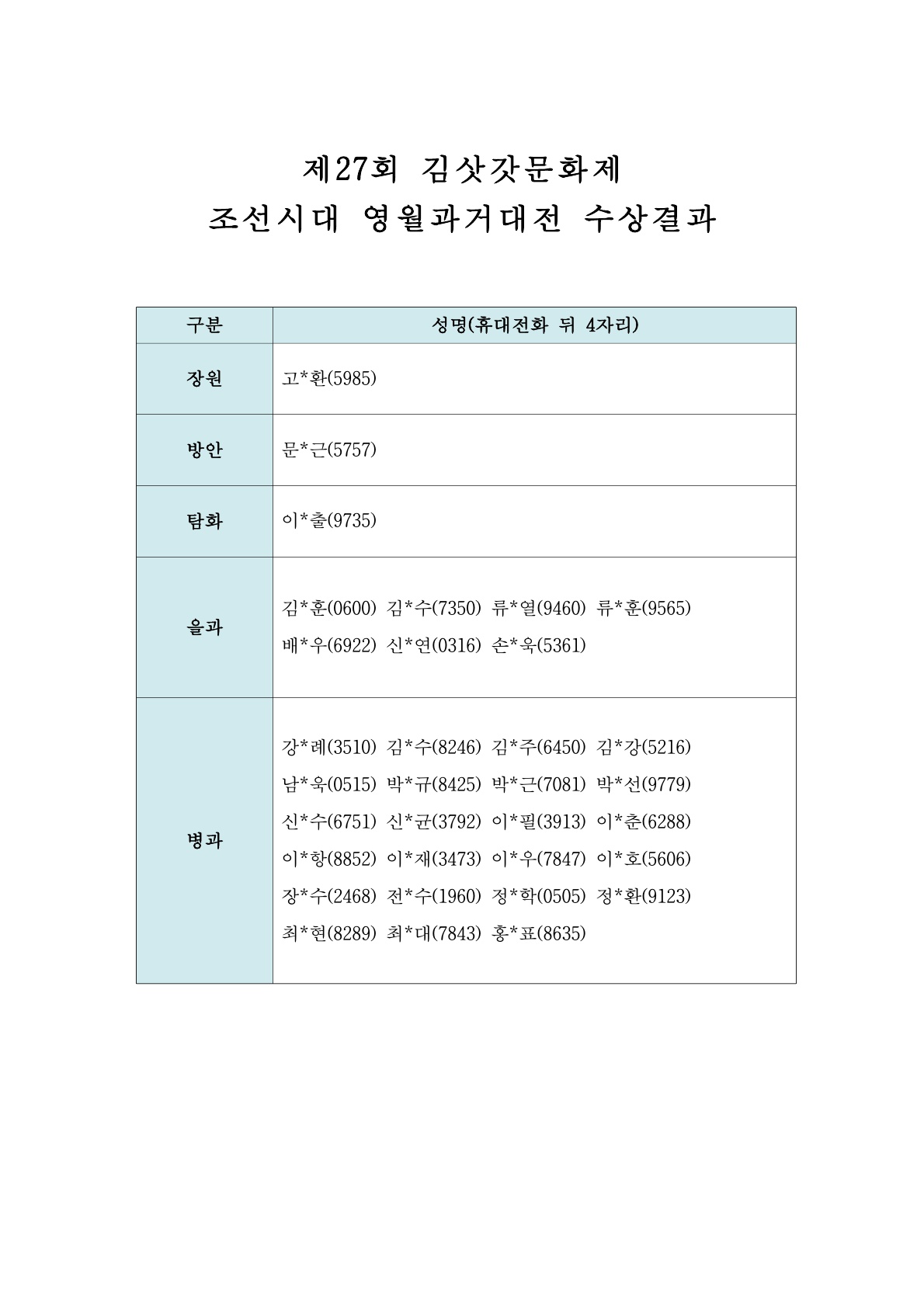 [제27회 김삿갓문화제] 조선시대 영월과거대전 입상자를 아래와 같이 공고합니다.