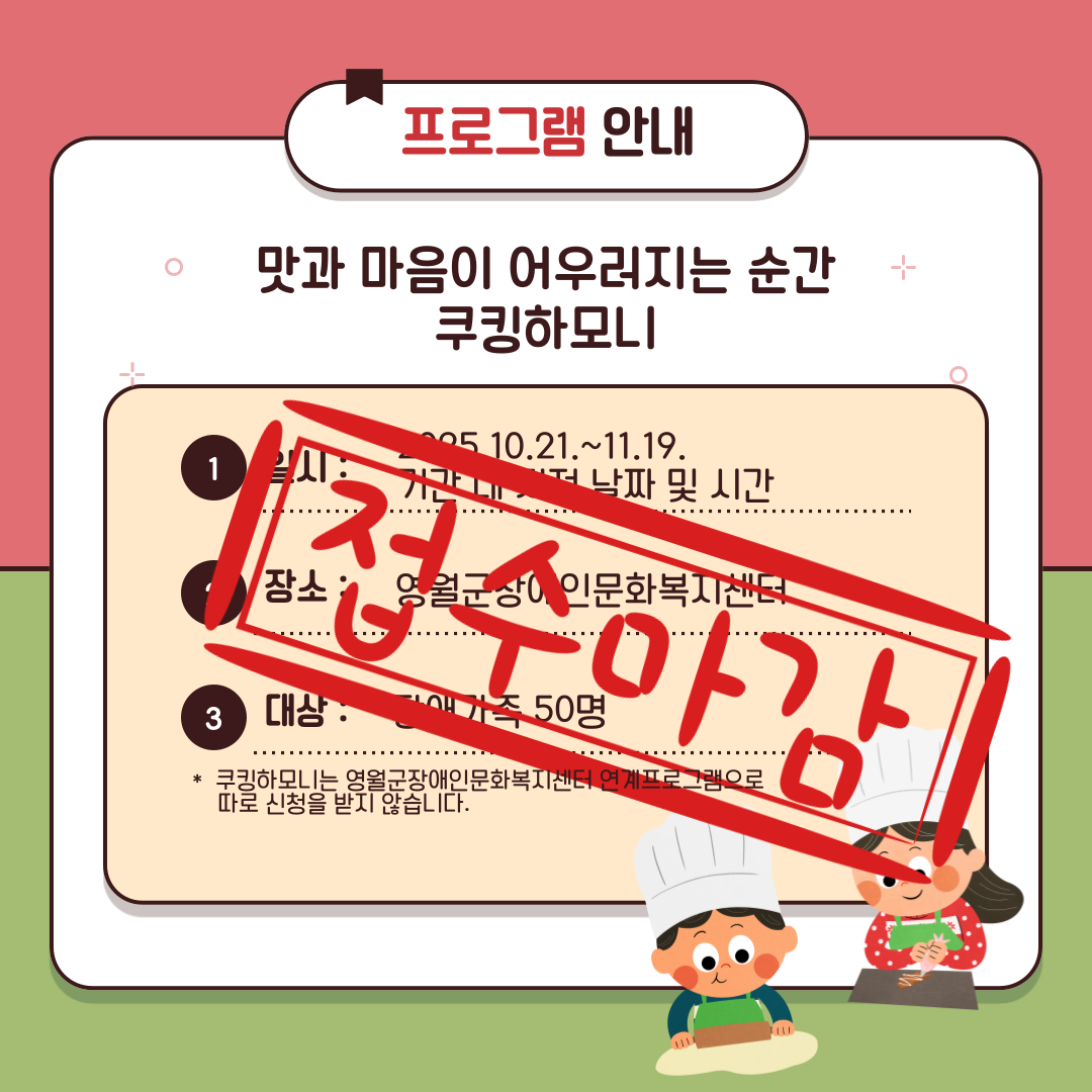 * '쿠킹하모니' 프로그램은 기관 연계 프로그램으로 참여자 모집이 완료되어 따로 신청을 받지 않습니다.