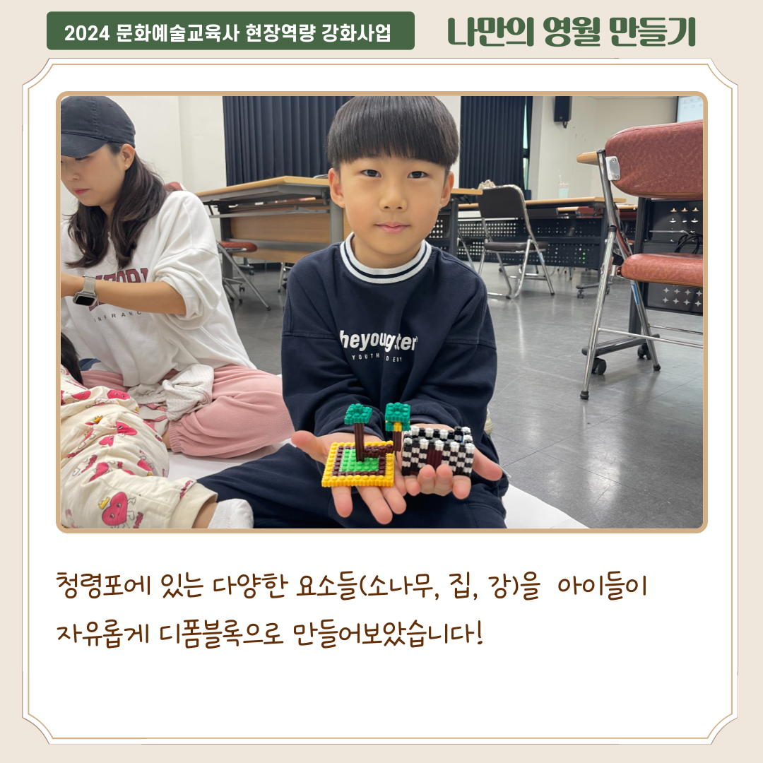청령포에 있는 다양한 요소들(소나무, 집, 강)을 아이들이 자유롭게 디폼블록으로 만들어보았습니다.