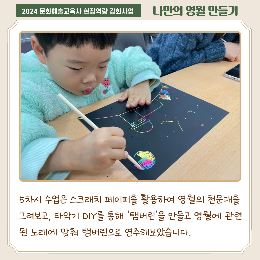 5차시 수업은 스크래치 페이퍼를 활용하여 영월의 천문대를 그려보고, 타악기 DIY를 통해 '탬버린'을 만들고 영월에 관련된 노래에 맞춰 탬버린으로 연주해보았습니다.