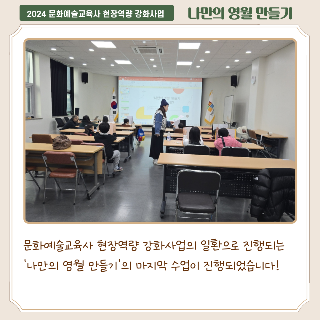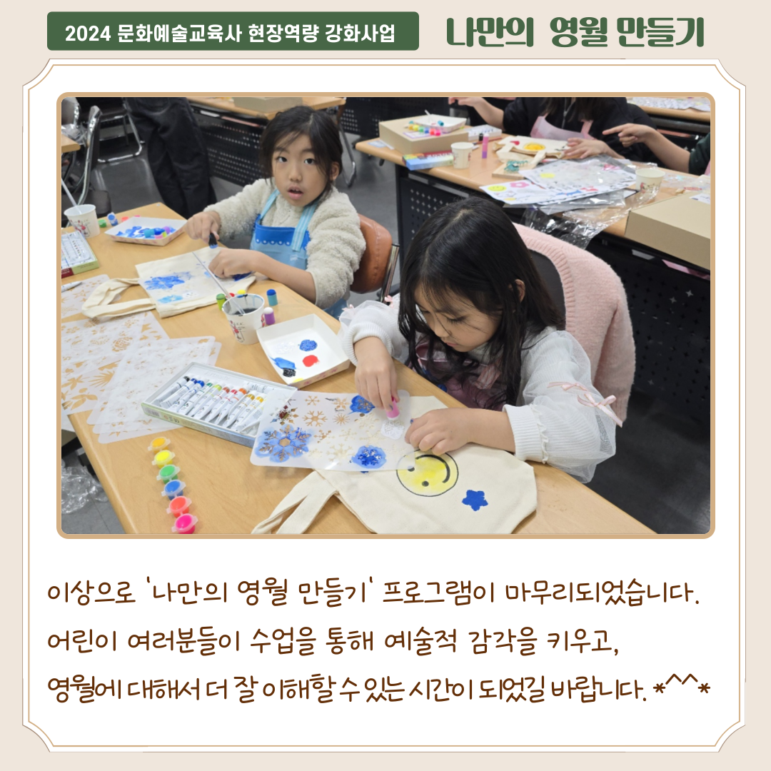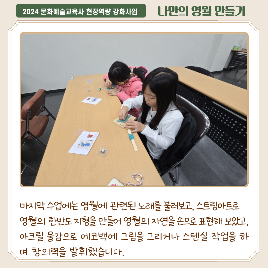어린이 여러분들이 수업을 통해 예술적 감각을 키우고, 영월에 대해서 더 잘 이애할 수 있는 시간이 되었길 바랍니다