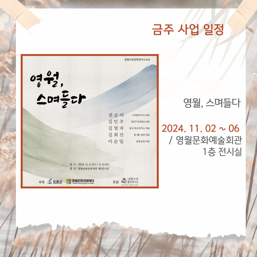 금주 지역예술인 지원사업 일정 안내드립니다.영월, 스며들다일정 : 2024. 11. 02~ 06장소 : 영월문화예술회관 1층 전시실군민 여러분의 많은 관심과 참여 부탁드립니다.
